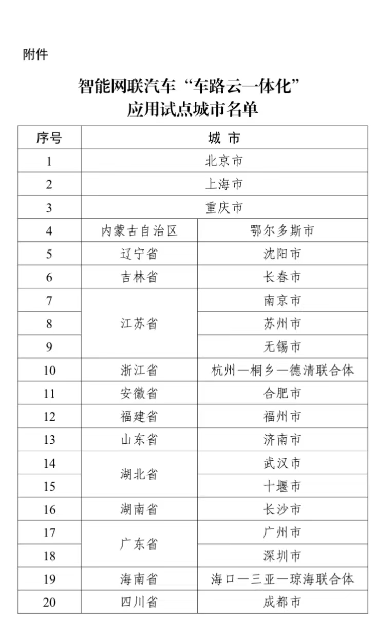 7月3日,据工信部消息,按照《工业和信息化部 公安部 自然资源部 住房和城乡建设部 交通运输部关于开展智能网联汽车“车路云一体化”应用试点工作的通知》(工信部联通装〔2023〕268号)安排,在自愿申报、组织评估基础上,确定了20个城市(联合体)为智能网联汽车“车路云一体化”应用试点城市。