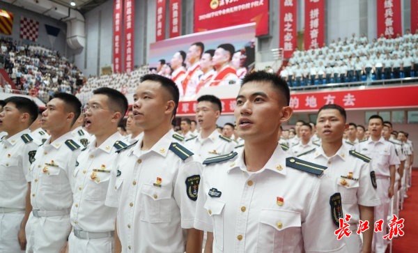长江日报记者在现场看到,海军工程大学领导宣读完相关命令、学位授予决定、海军飞行学员录取通知、学业成绩优异和获奖者名单后说:“奔赴祖国万里海疆,同学们,你们准备好了吗?”全体毕业学员齐声高呼:“听党指挥!能打胜仗!作风优良!”他们发出的铿锵誓言响彻云霄,在会场中久久回荡。