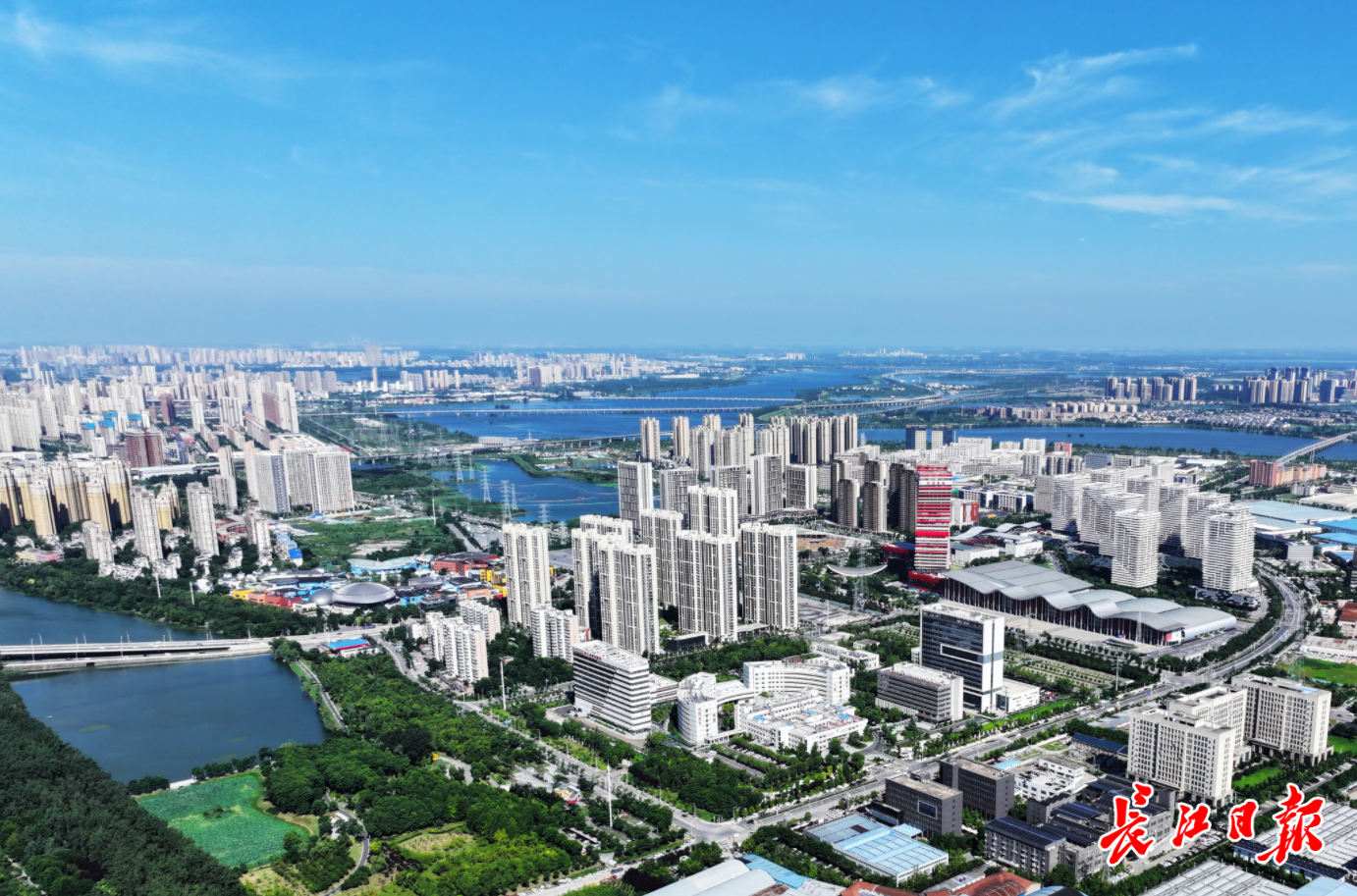 7月5日,雨过天晴,我市上空碧空如洗。无人机俯瞰武汉大道、三环线江岸段、盘龙大道,碧水蓝天,城市面貌清晰可见。记者金振强 航拍