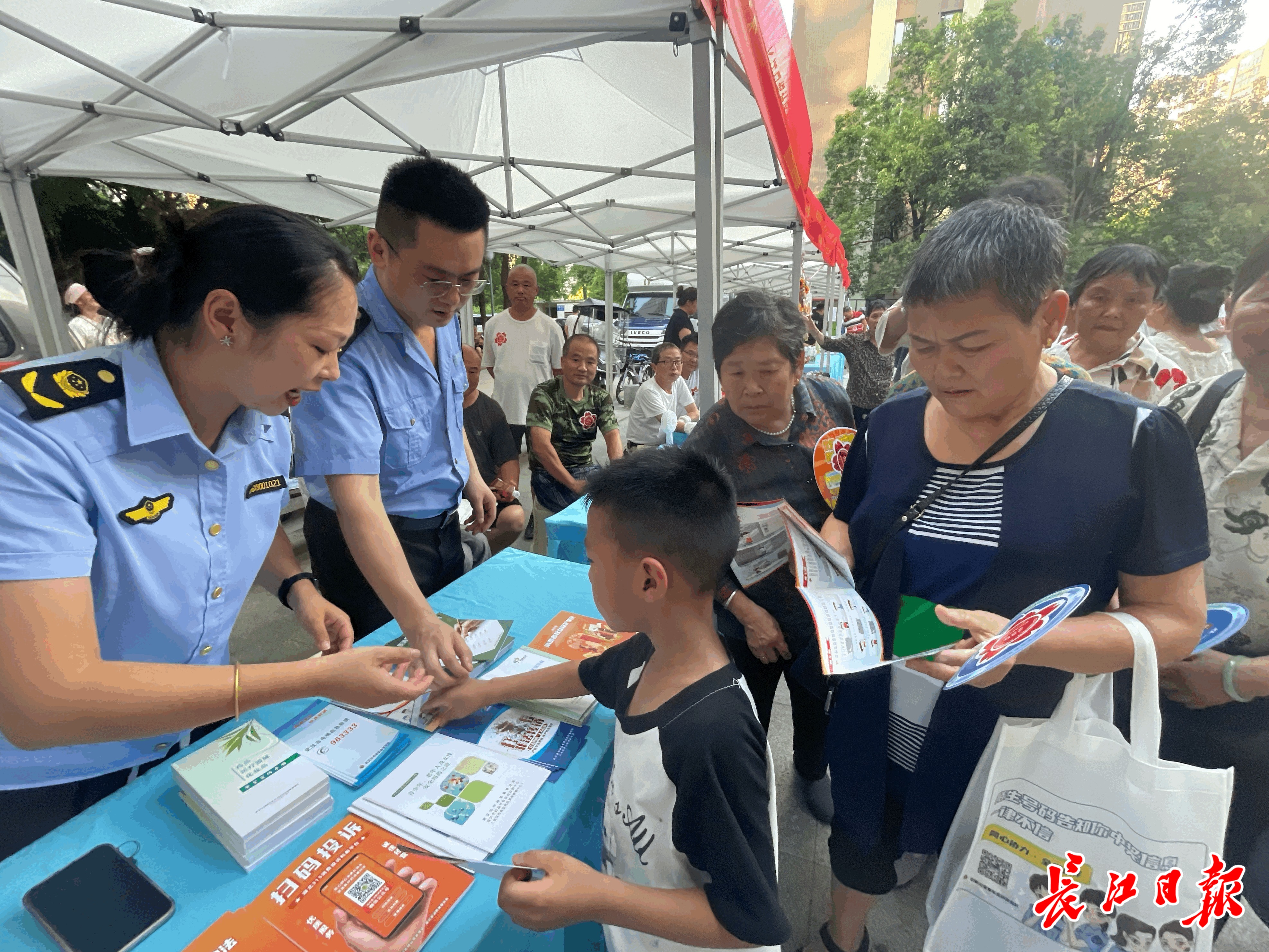 “夏天温度高,食物容易腐败变质,过期药品千万不要吃。”活动尚未开始,区市场监管局第八市场所工作人员早早来到现场,发放宣传资料,向群众宣传食品药品安全,讲解如何辨别假冒伪劣产品,如何识别传销,如何正确消费维权。区公安分局左岭派出所民辅警携带的近百份印有反电诈宣传用语的无纺布购物袋,连同各种反电诈宣传资料,被现场居民争先恐后领取。
