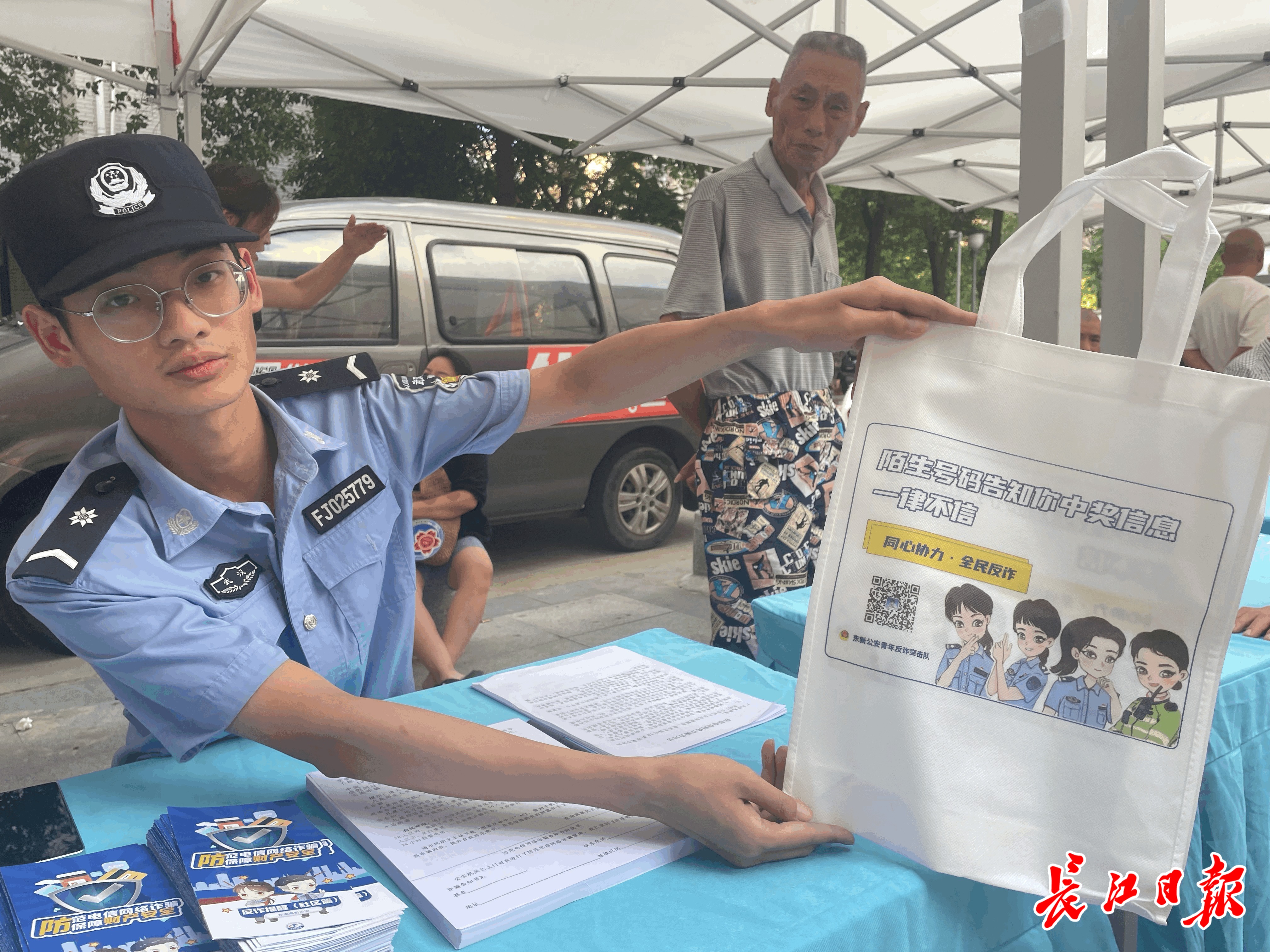 警务人员现场发放反电诈购物袋。长江日报记者 尹勤兵 摄