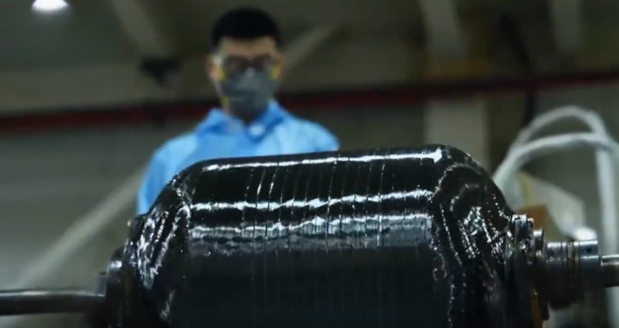细如丝,且柔软,碳纤维是如何“变身”的呢?研发人员通过视频向记者展示这个过程:在制造车间,从机器一端伸出来的碳纤维,像“缠毛线球”一般,一圈一圈被缠绕在圆筒状的火箭发动机壳体上。
