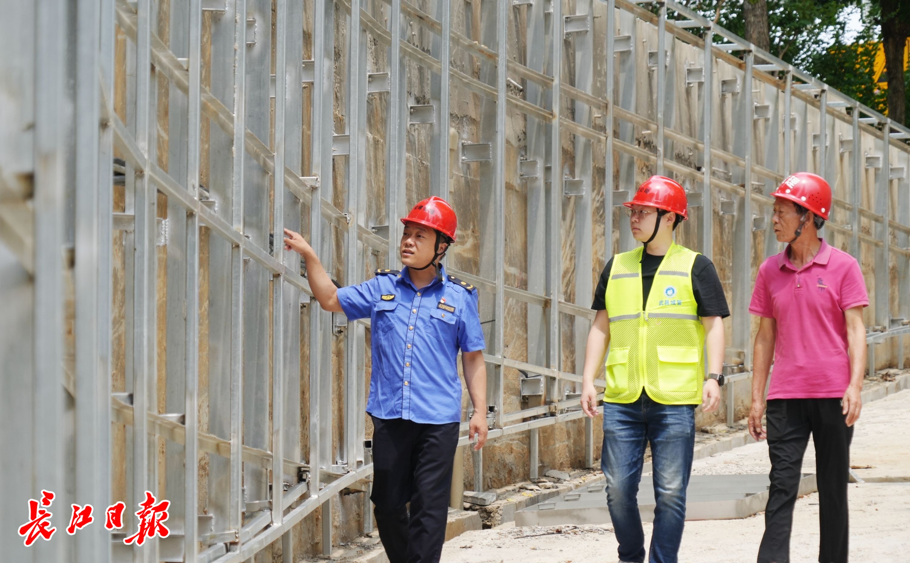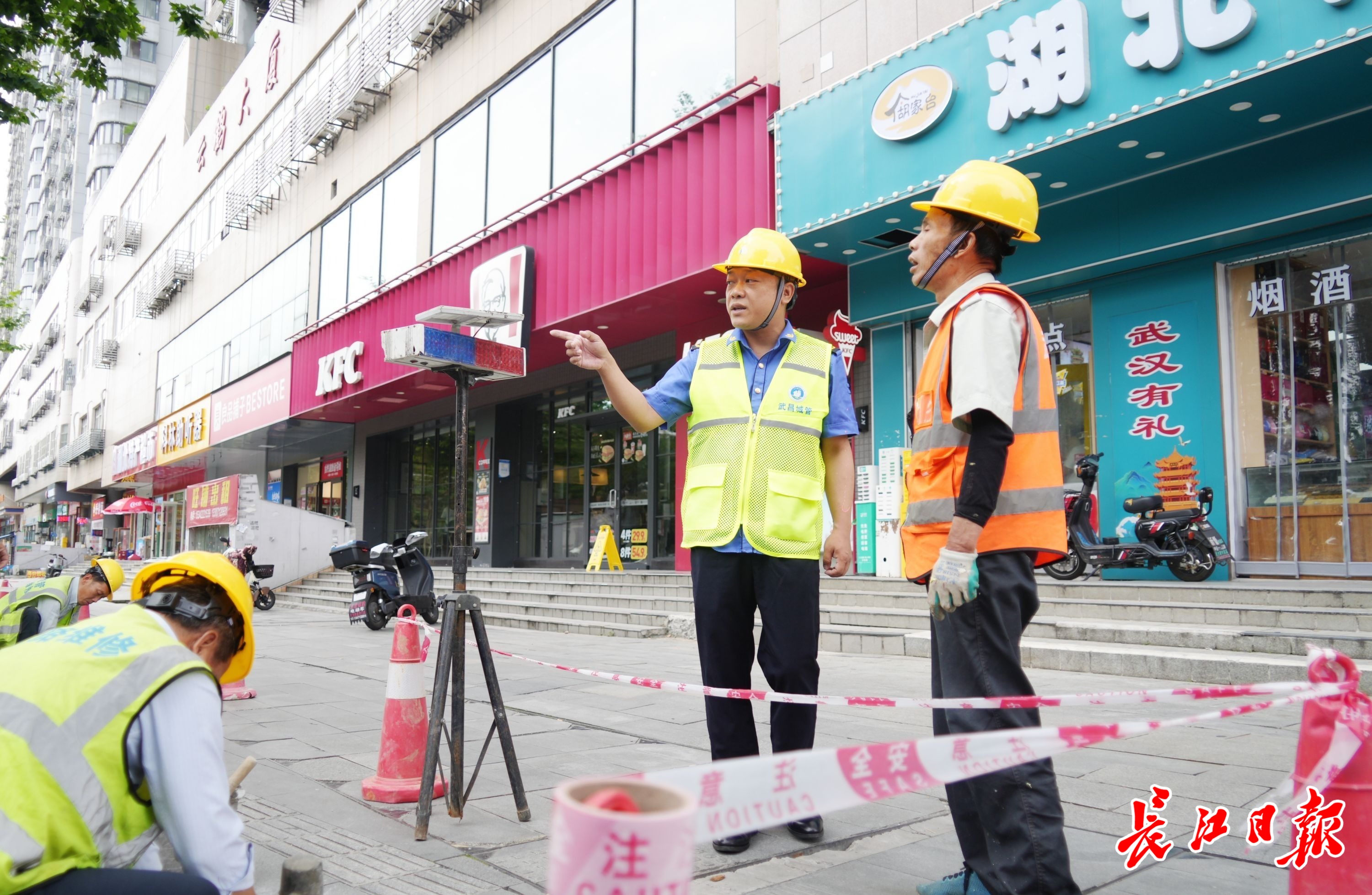 武昌阅马场街头,龚颖(左)现场指导周边人行道的维修施工。记者何晓刚 摄