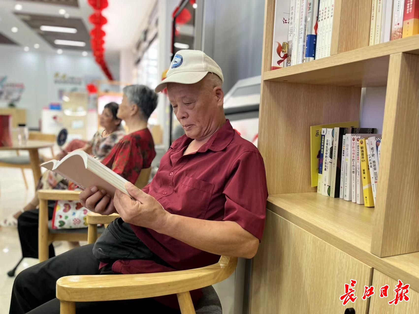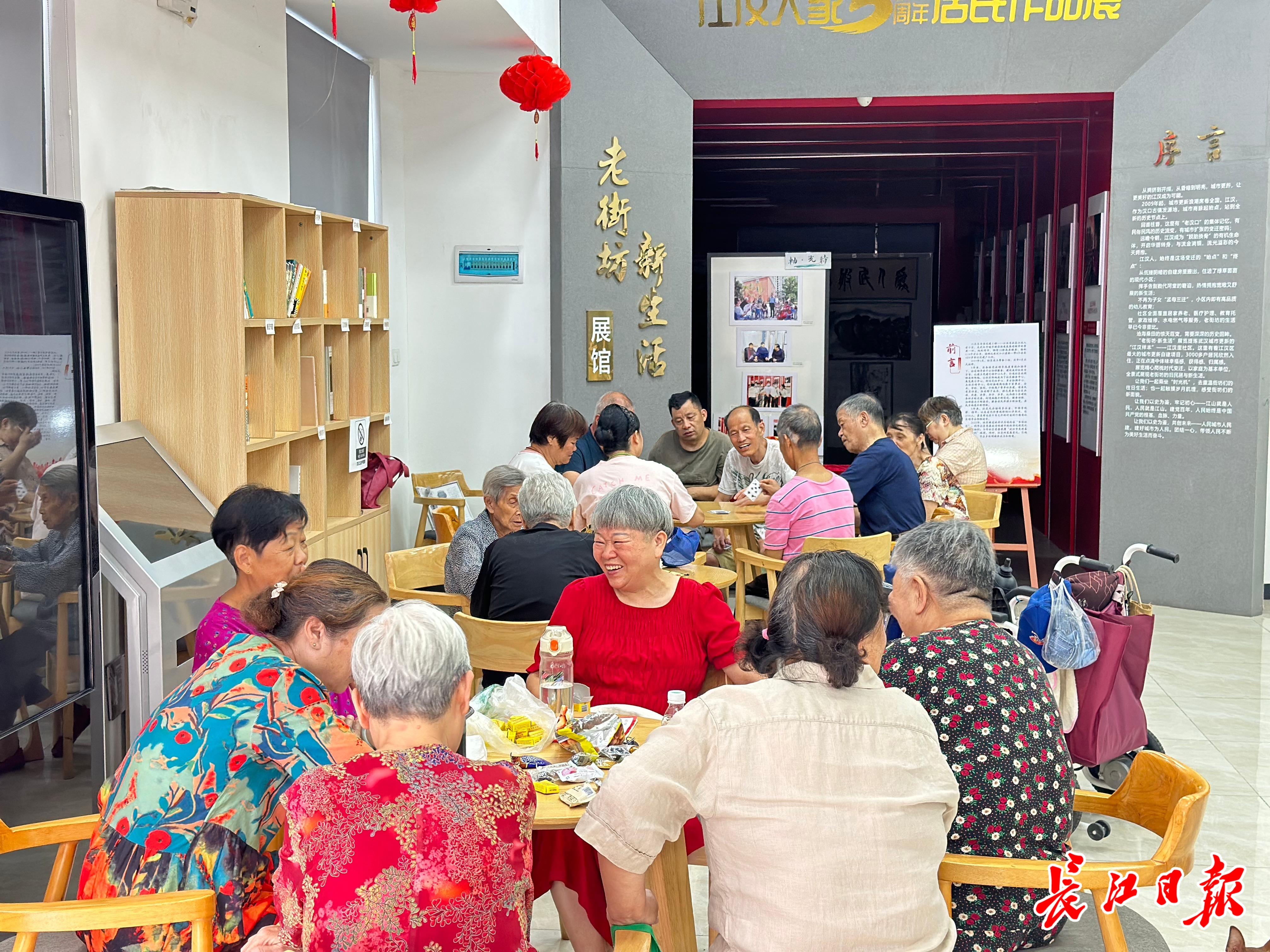 走进江汉区汉兴街道江汉里社区党群服务中心,阵阵凉意袭来,大厅温度控制在25℃左右,大厅一侧摆放着书架,上面有养生保健、文学、历史等类别的读物,还有棋类玩具提供。几位老年居民正捧着杂志、书籍阅读,一旁还有热茶提供。居民张奶奶接了一杯热茶,和街坊聊着天,“每天上午都会来这里坐坐,下午有感兴趣的课程也会来学习”。