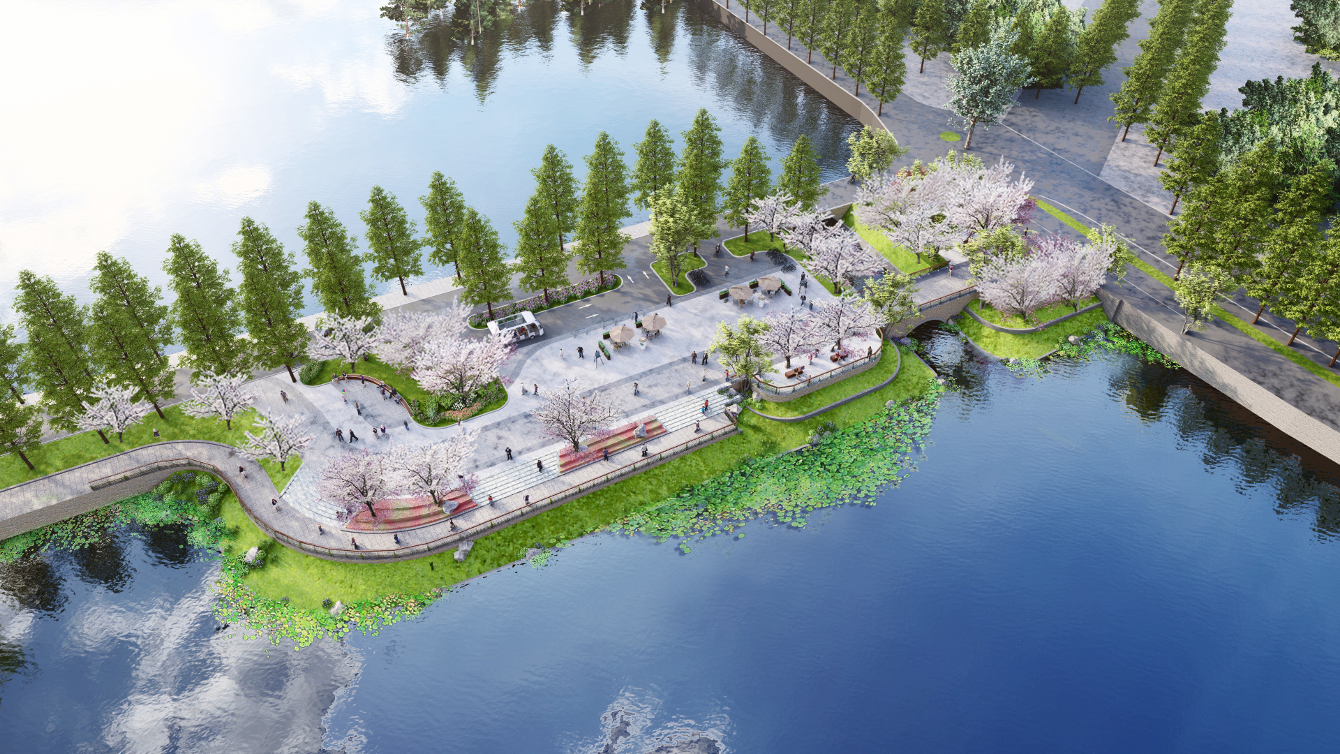 “项目将巧妙利用驳岸高差嵌入二级驿站。”平湖珞樱项目负责人刘俊勇说,建成后,驿站屋顶将变成观景广场,下层设置亲水平台以及凌波栈道。今后的滨水体验是上层观水、下层亲水。为了延续“书香道”的主题,驿站屋顶还会采用武汉大学同款“珞珈绿”琉璃瓦。