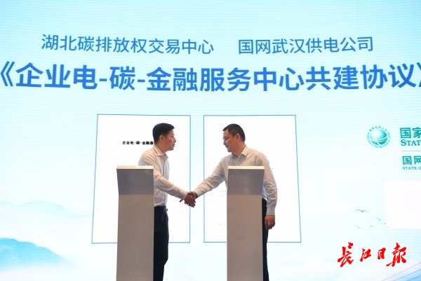 湖北碳排放权交易中心与国网武汉供电公司签订《企业电-碳-金融服务中心共建协议》。记者高勇 摄