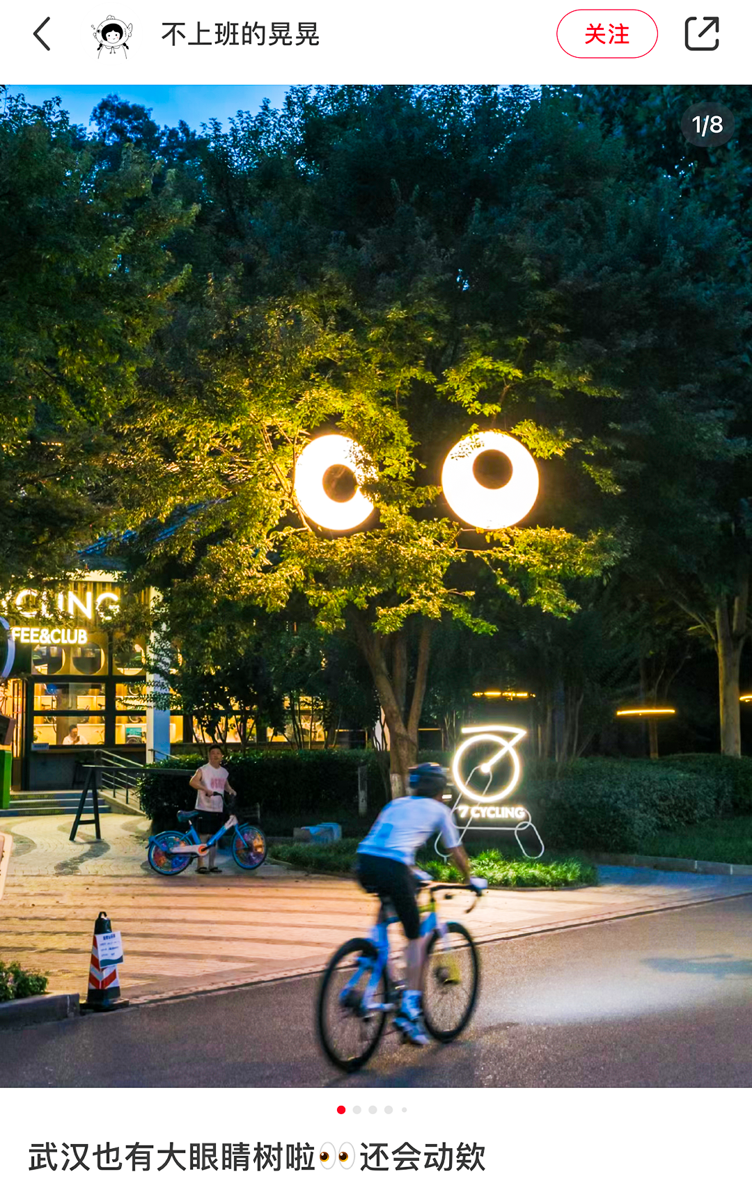 长江日报记者走访发现,在武汉,年轻人正以一种独特的方式探索这座城市的魅力——通过社交网络寻找热门打卡地,再不断发掘新的游玩方式。这种“青春造景”现象,也让原本并非景点的区域,因年轻人的聚集而焕发出新的魅力。7月某个下班后的傍晚,一群年轻人看着前些天在网上发现的攻略,找到东湖绿道枫都山附近那棵被装上会转动“眼睛”的树,惊叹于这奇妙的创意,感受着城市中隐藏的浪漫。这棵树被称为武汉第一棵会长眼睛的树。原来,旁边的咖啡馆老板为这棵树装上了能360缓慢转动的“眼睛”,安装LED灯后,树叶间的大眼睛炯炯有神地望着绿道上的行人,每晚吸引了大量年轻游客前来观赏。