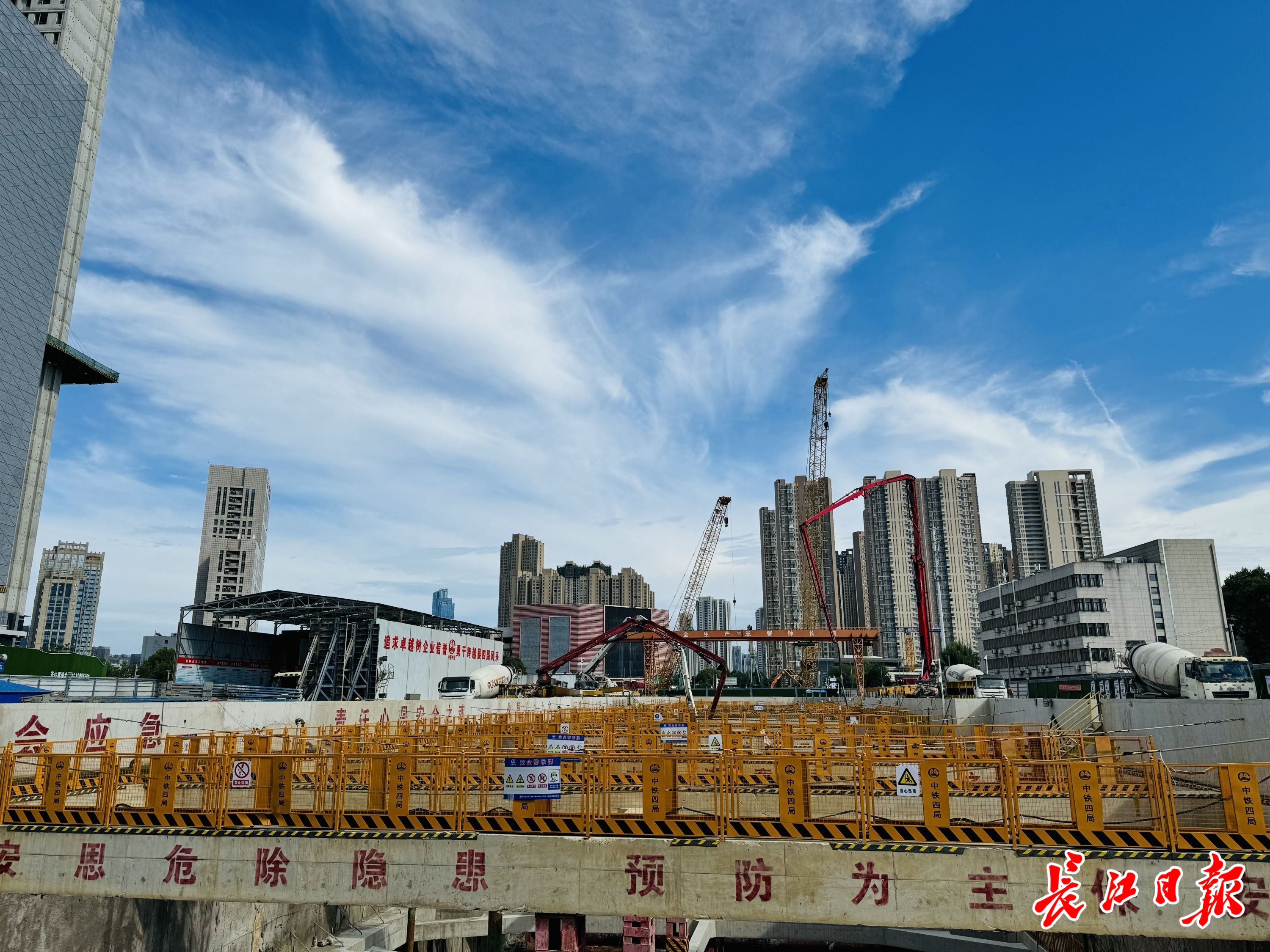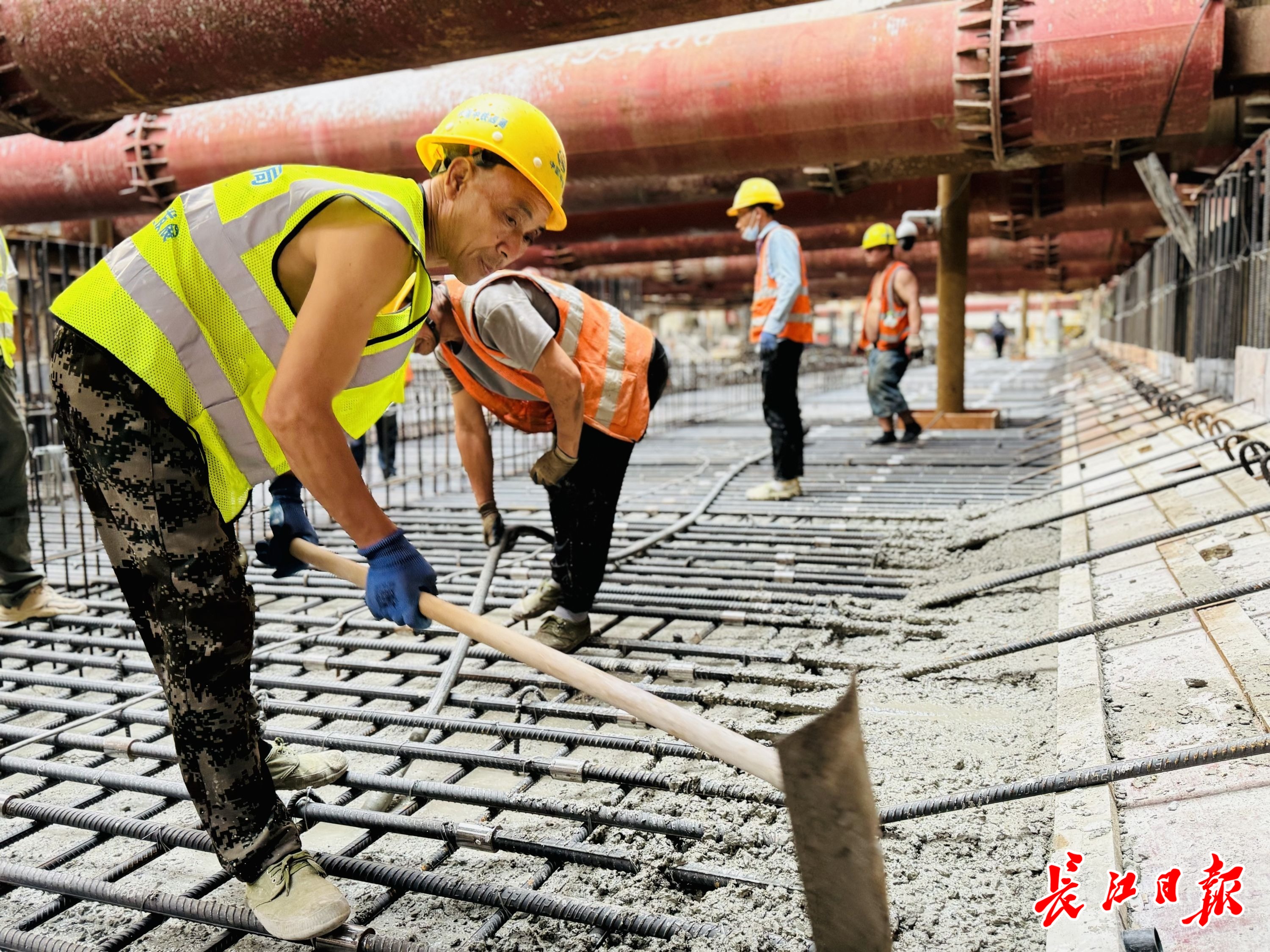 当日,长江日报记者深入相当于11层楼的车站基坑底部,施工人员正在浇筑最后一方混凝土。基坑经过1个月连续施工,这个庞然大物共“吞掉”近7000立方米混凝土,钢筋用量1500吨,接下来将全面进入主体结构施工。