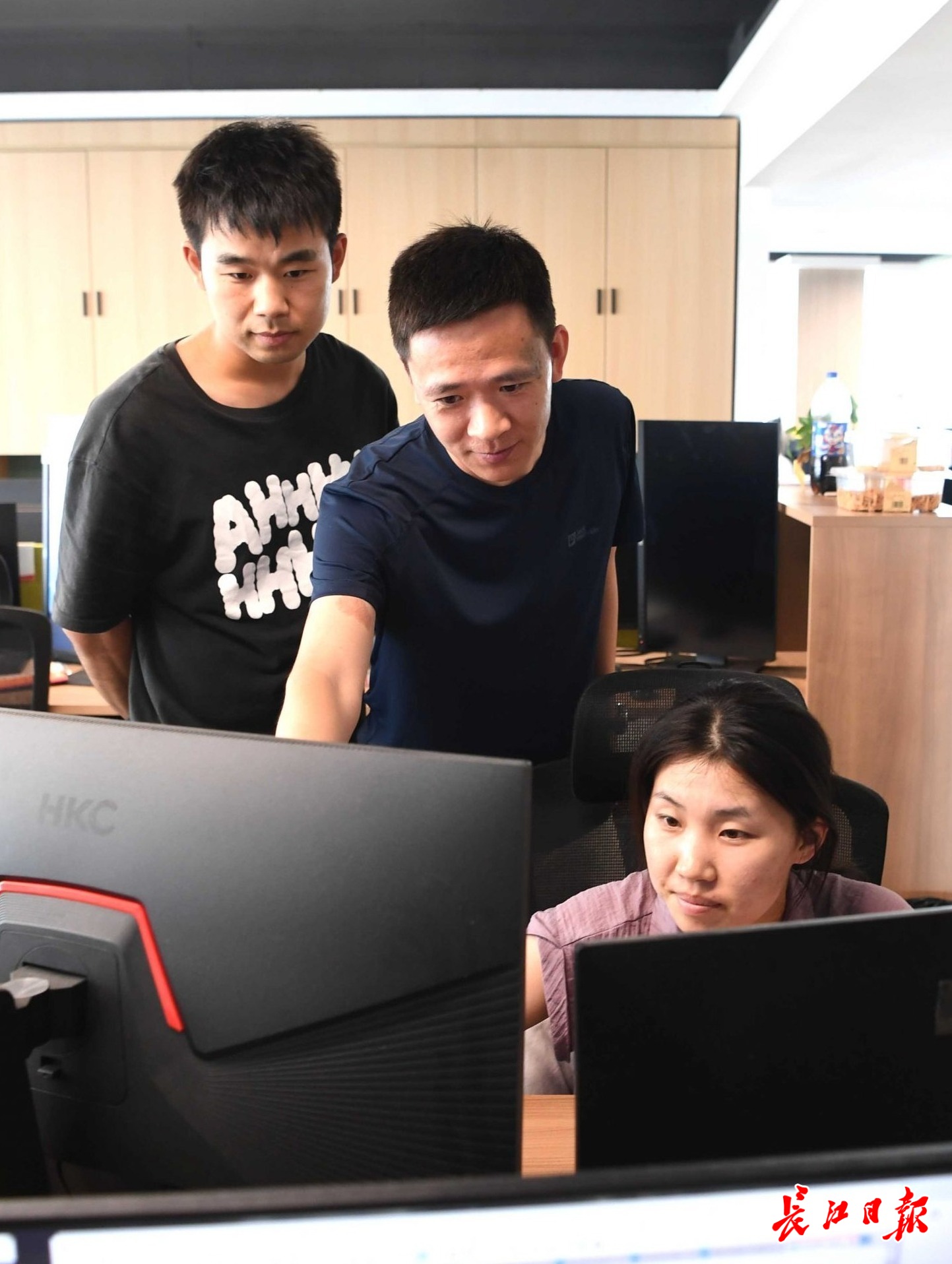 华工科技中央研究院的软件工程师在一起研究设计方案。 记者高勇 摄