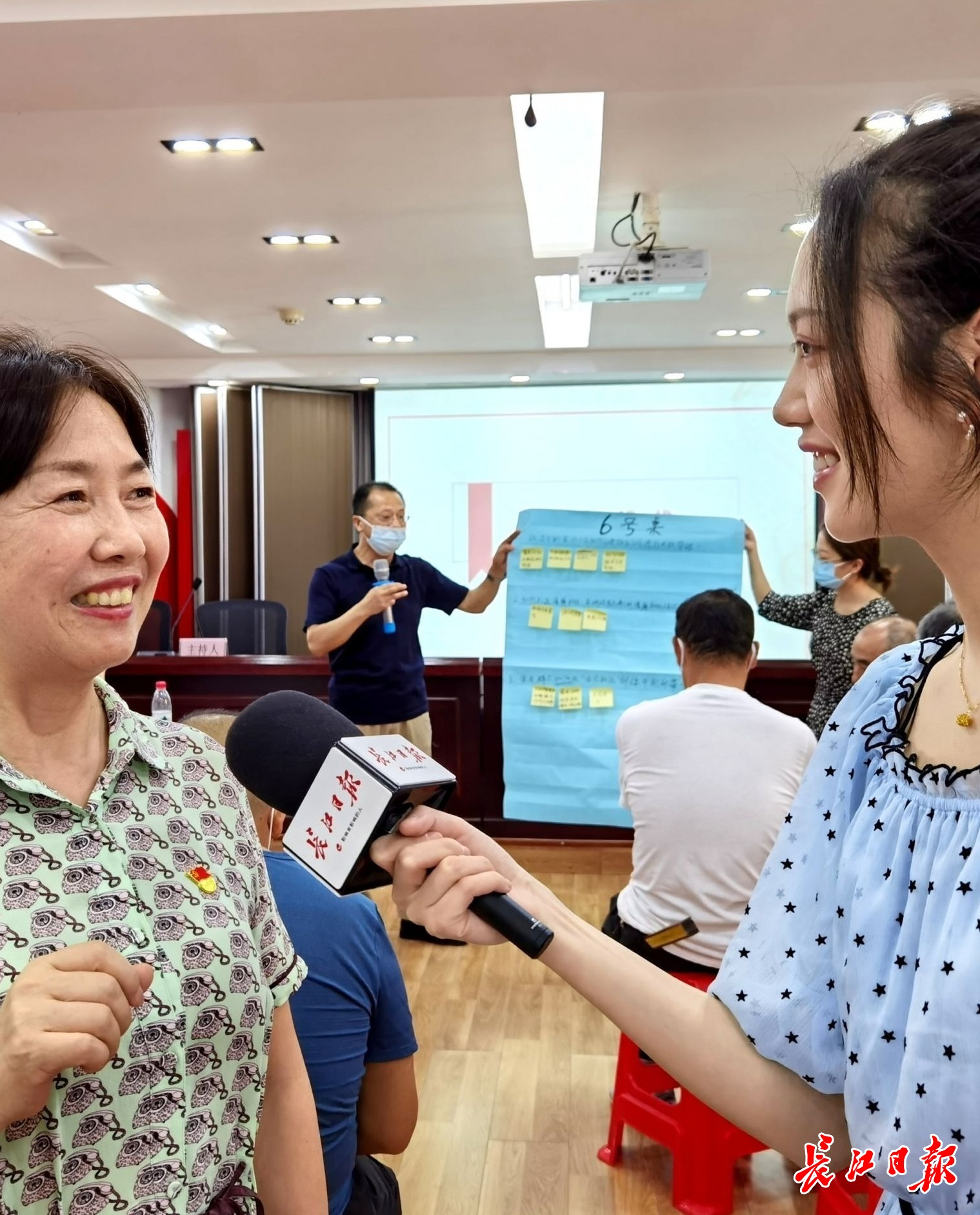 唐家墩街道西桥社区书记董守芝(左)向长江日报记者介绍社区“月月谈”经验。记者詹松 摄