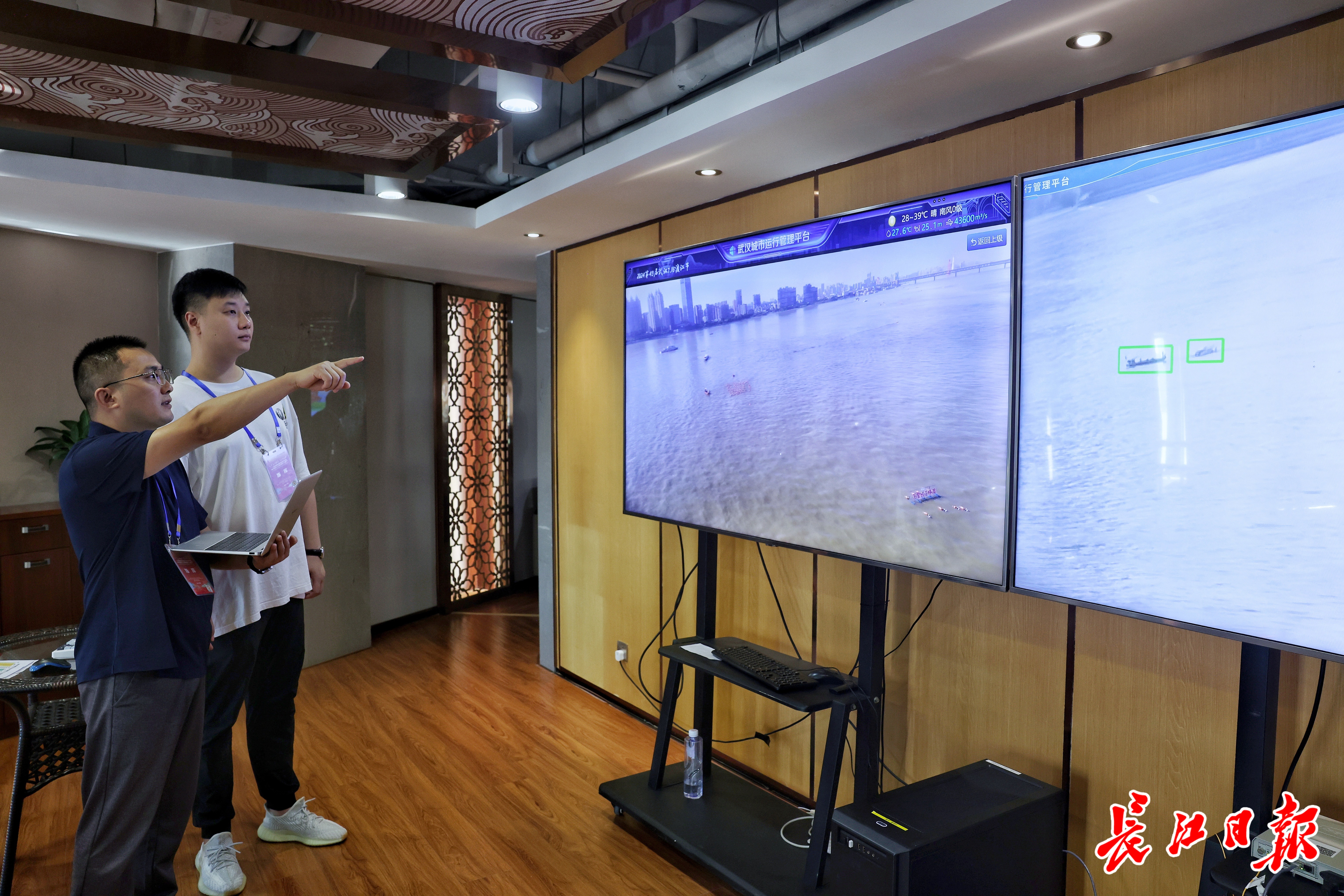 记者在指挥部的大屏上看到,黄色方框追踪选手,绿色方框识别船只。根据全景画面和实时数据,保障团队人员点击鼠标便可瞬间进行画面抓取,放大查看任一点位的突发情况,横渡方队的队形变化、方向调整、行进位置都清晰可见。