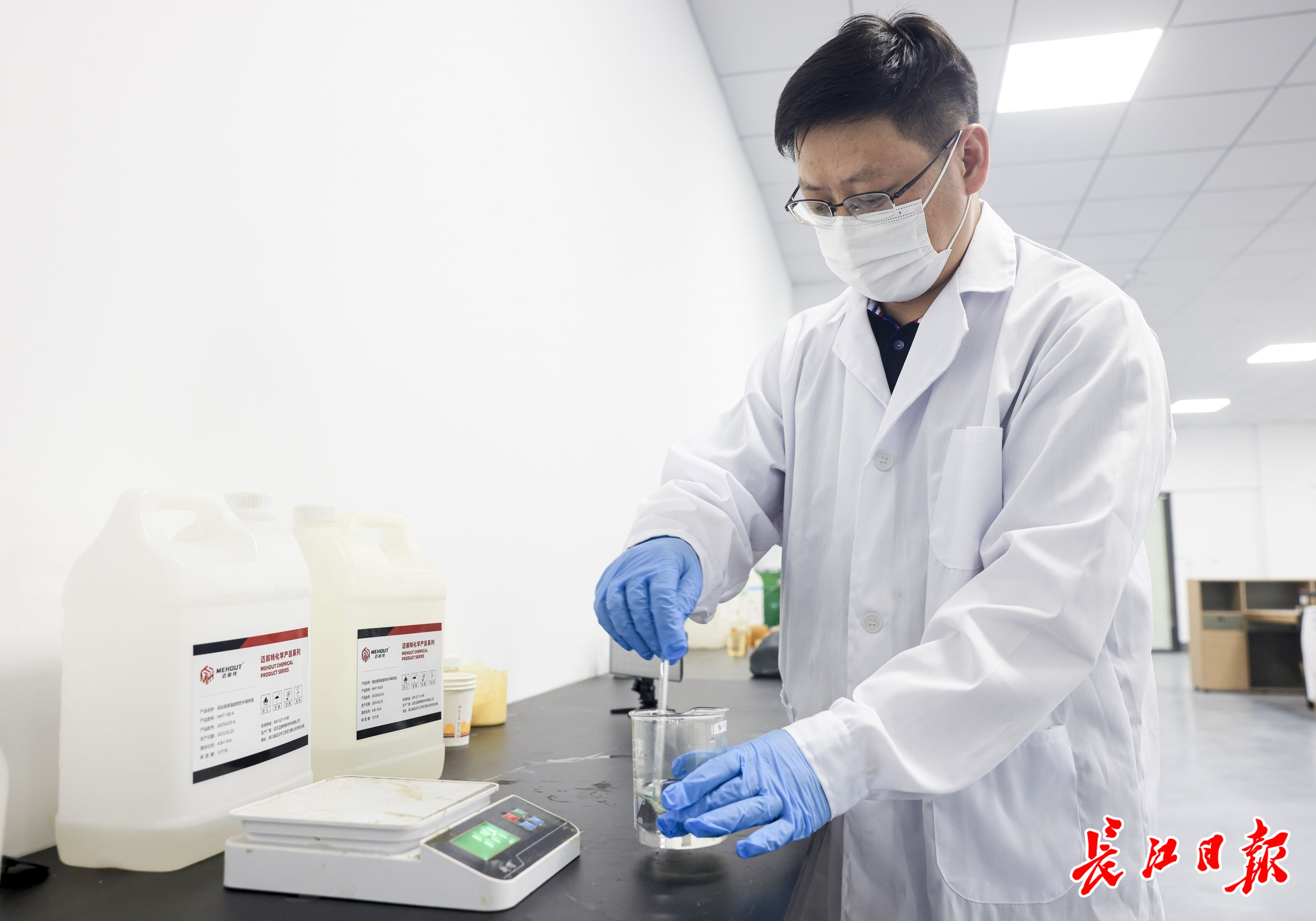 实验室中,迈郝特市场研发总监汪源用两种不同的原料调制的“隧道胶水”刚性环氧树脂。记者 胡冬冬 摄