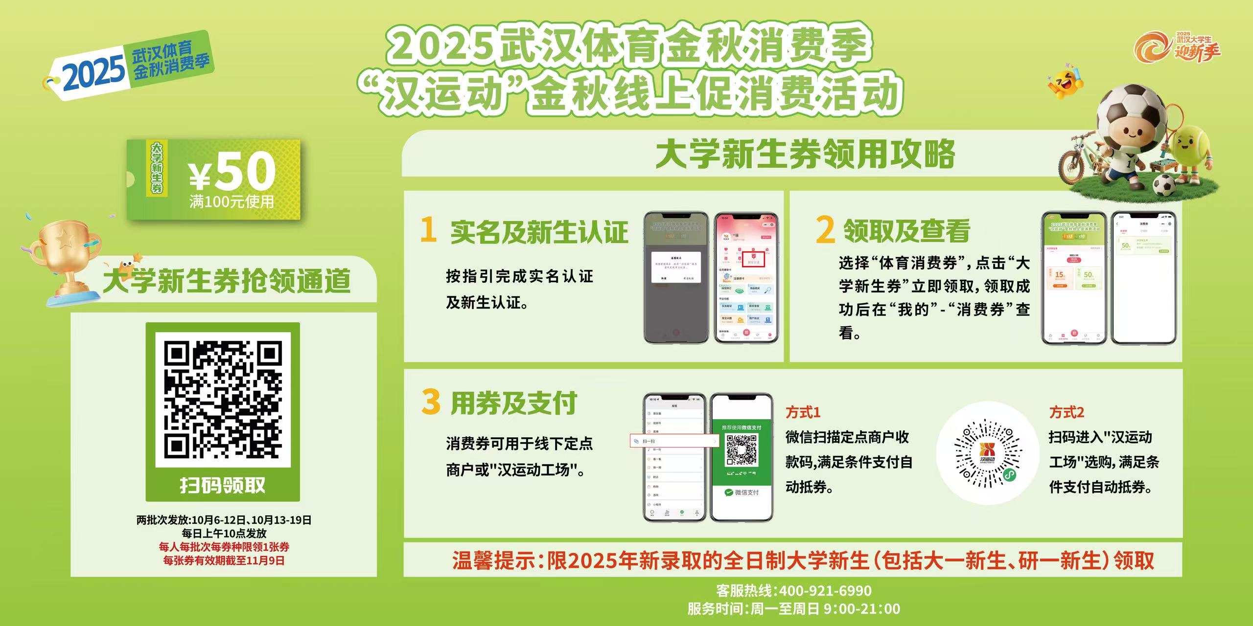 随着2025武汉体育金秋消费季和2025武汉大学生迎新季“Young动江城”系列活动启动,“汉运动”金秋线上促消费活动将正式上线!1000万元体育消费券等你来抢,线上领券、线下使用,尽享运动购物乐趣。