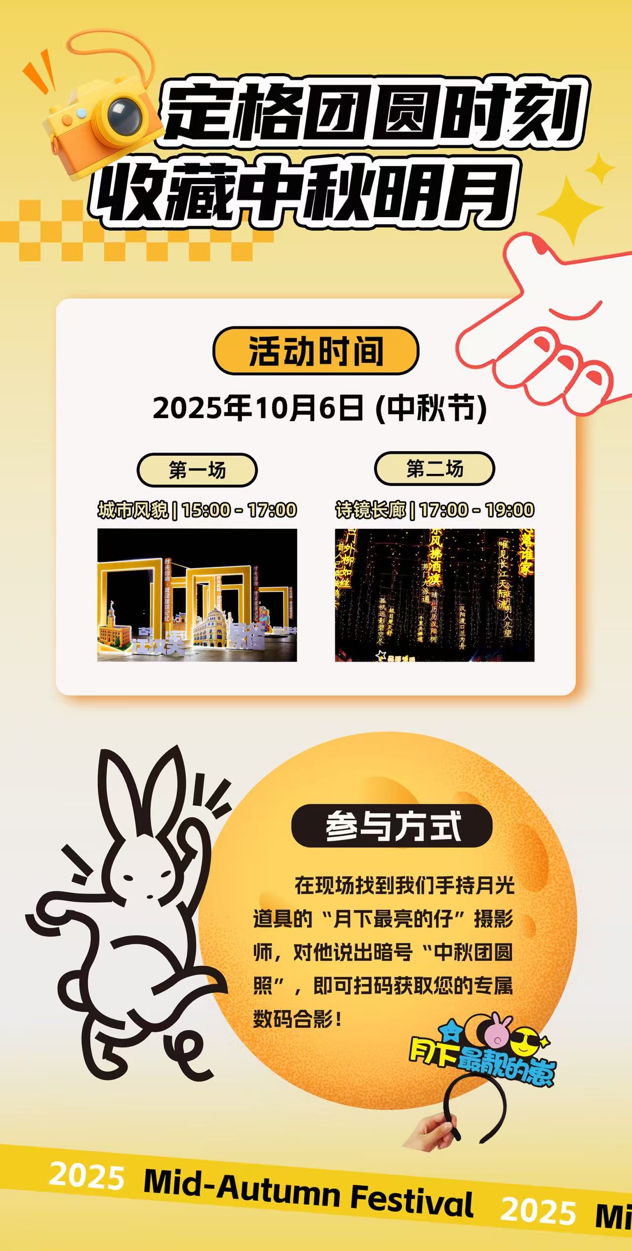 活动组委会介绍,为了增强今年购房节期间的趣味性和互动性,10月6日下午活动现场将化身“月光剧场”。中秋专场活动整体分为两场,第一场时间为15:00—17:00,活动地点在城市风貌区;第二场时间为17:00—19:00,活动地点在诗镜长廊区。参与活动的人群,只需找到手持发光月亮道具“月下最亮的仔”的摄影师,并对他说出暗号“中秋团圆照”,即可扫码获取自己的专属数码合影,届时您与家人或挚友的身影,就可与黄鹤楼、江汉关等武汉地标和诗情景点同框,化作一张独一无二的团圆纪念。