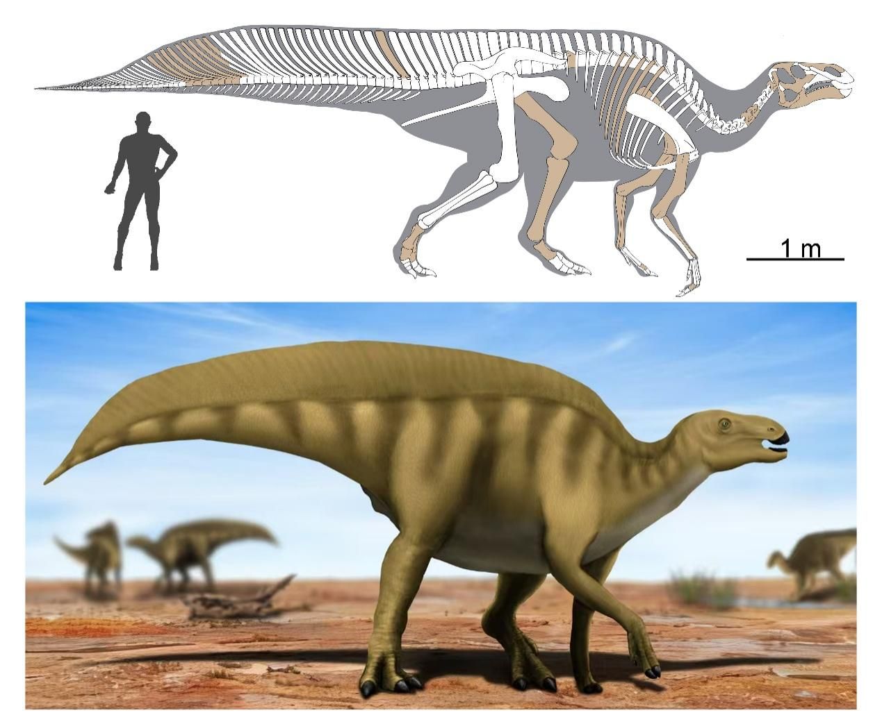 研究团队对骨骼形态详细分析时发现,帆尾贡水龙具有独特的形态特征,尤其是其尾部构造令人瞩目:尾椎神经棘显著延长,其长度与椎体高度之比高达8.5,形成特有的“帆状”结构。这一特征在鸭嘴龙类中尚属首次发现,极大拓展了学界对鸭嘴龙类形态多样性的认知。