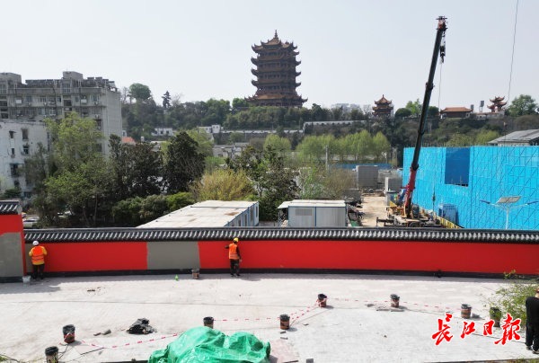 地铁5号线司门口黄鹤楼站外,与黄鹤楼同框的新红墙,雏形初现。这面单日客流破20万人次的红墙,将整体抬升7米、建于高架公园之上,5月投入使用后,游客照片中的黄鹤楼变得更“立体”。