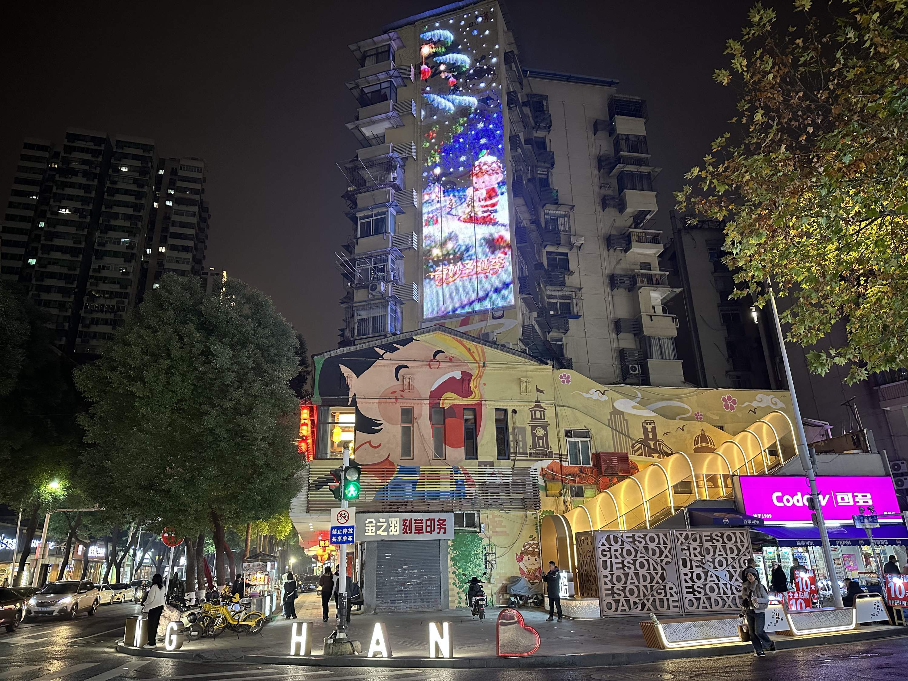 在江汉区万松园雪松路,美食香气与更新后的街景交织。“松仔”主题IP成了老街新符号,网帘灯投出热干面、鸭脖的光影,与彩绘墙构成“美食长廊”。原电影制片厂的拱门融入云街,留住几代人的胶片记忆。从卖小吃到售文化,烟火气里长出了文化魂。