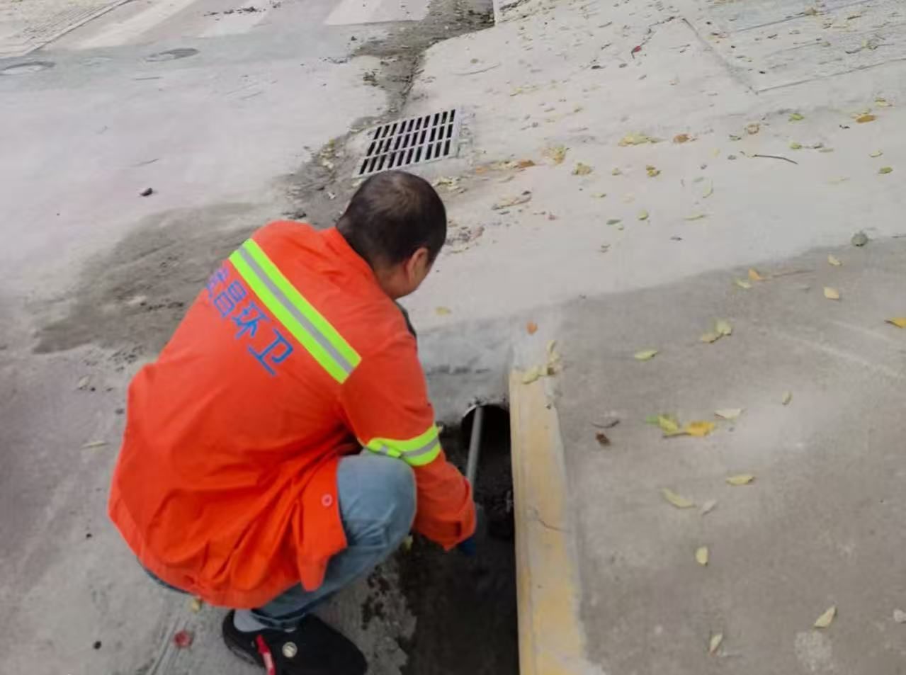 4月8日上午,武昌区中南路清洁队环卫人员正在清淘公正路排水盖附近的杂物。通讯员供图