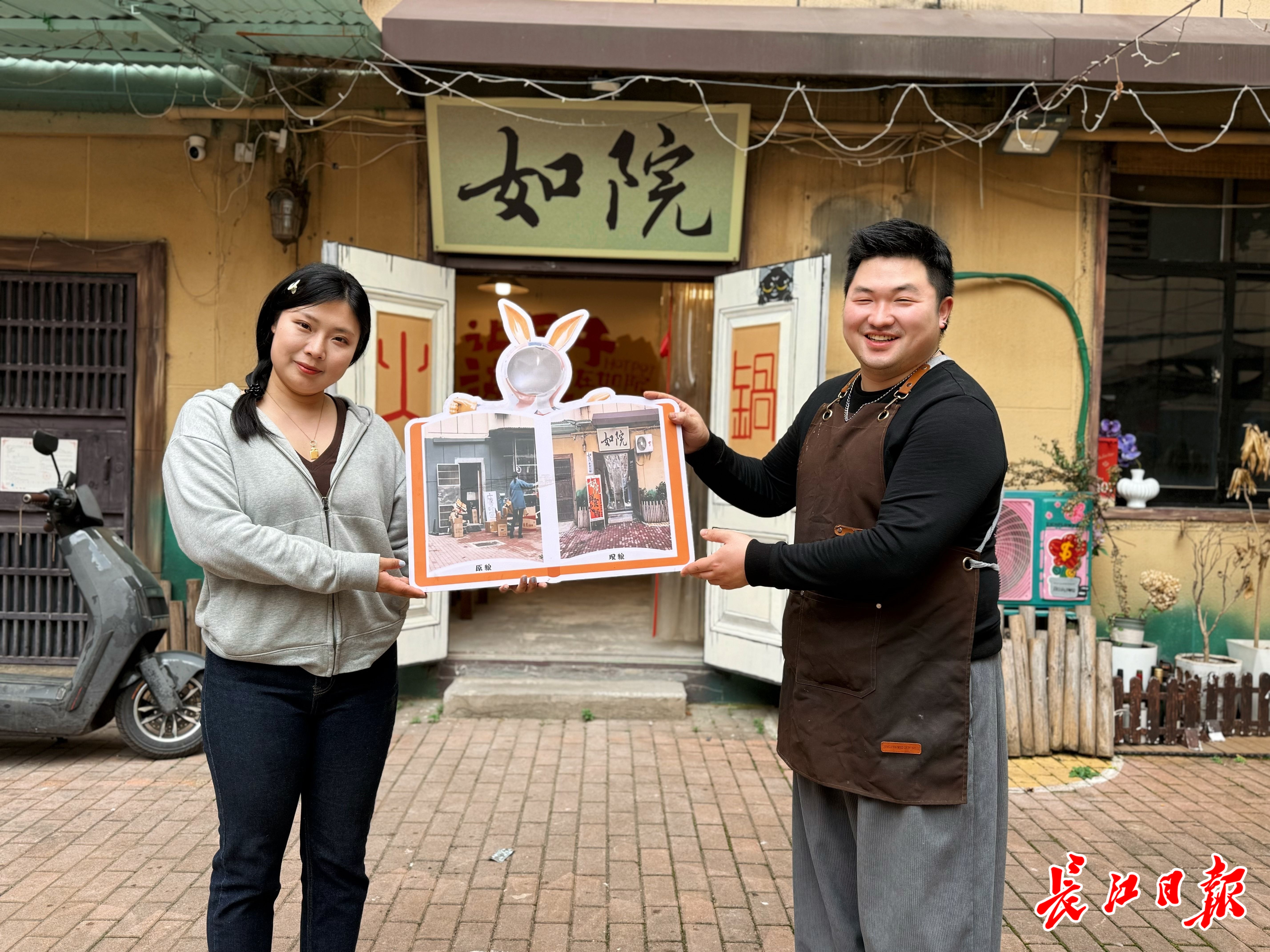 李旖旎(左一)和韩羿飞(右一)在“如院”前合影,他们手中的牌子展示了社区废品站变成青春小店的过程。 记者刘克取 摄