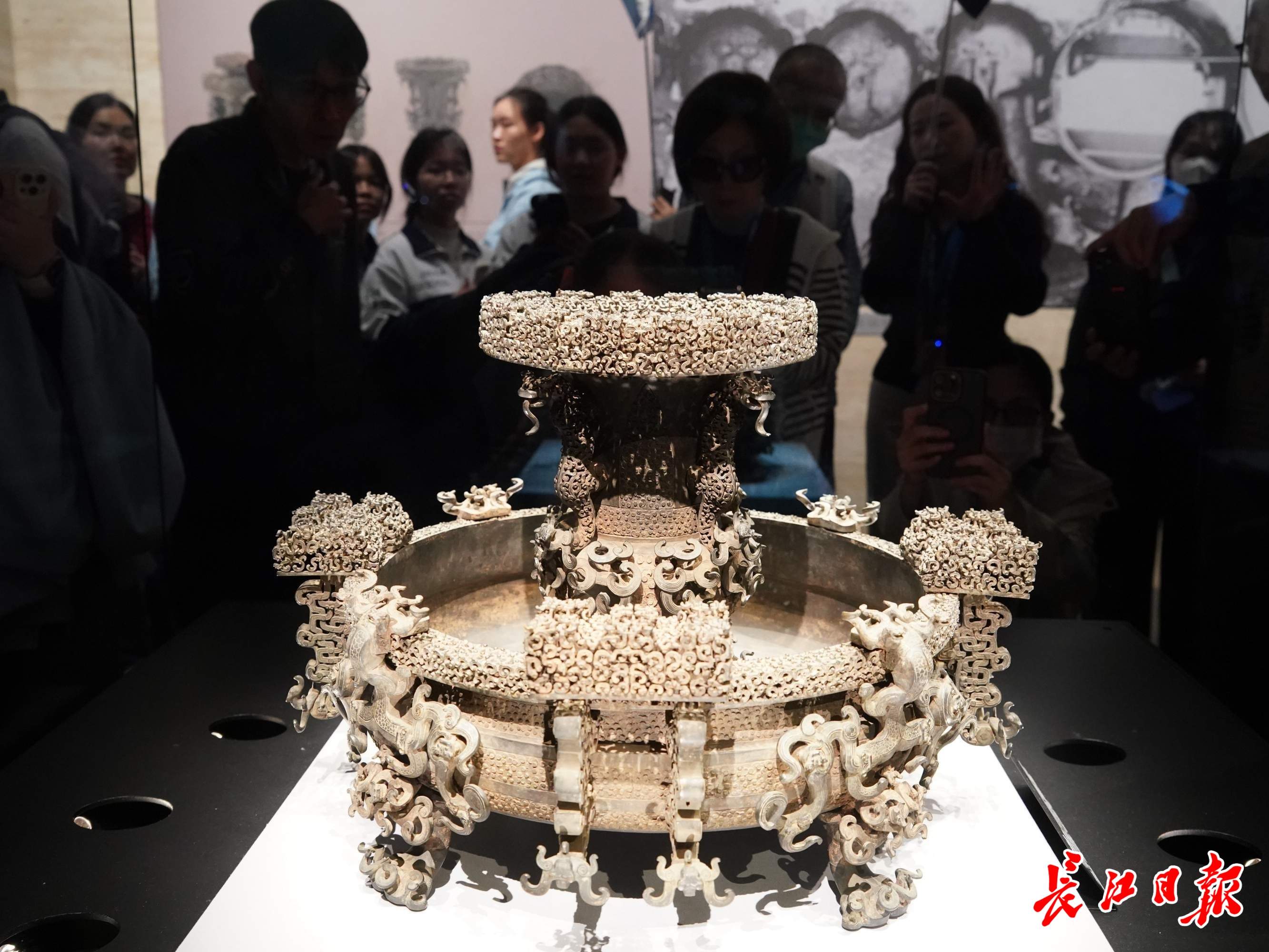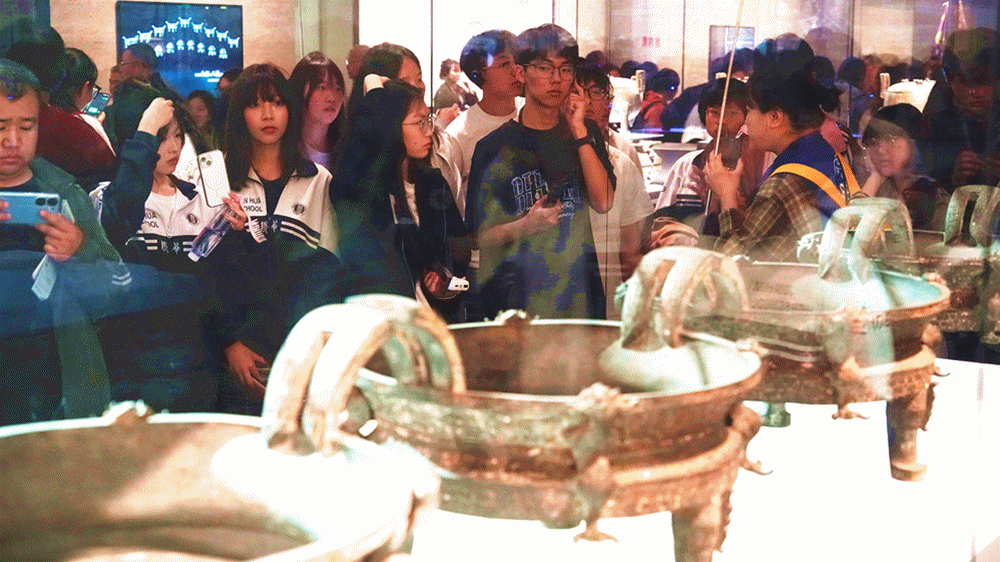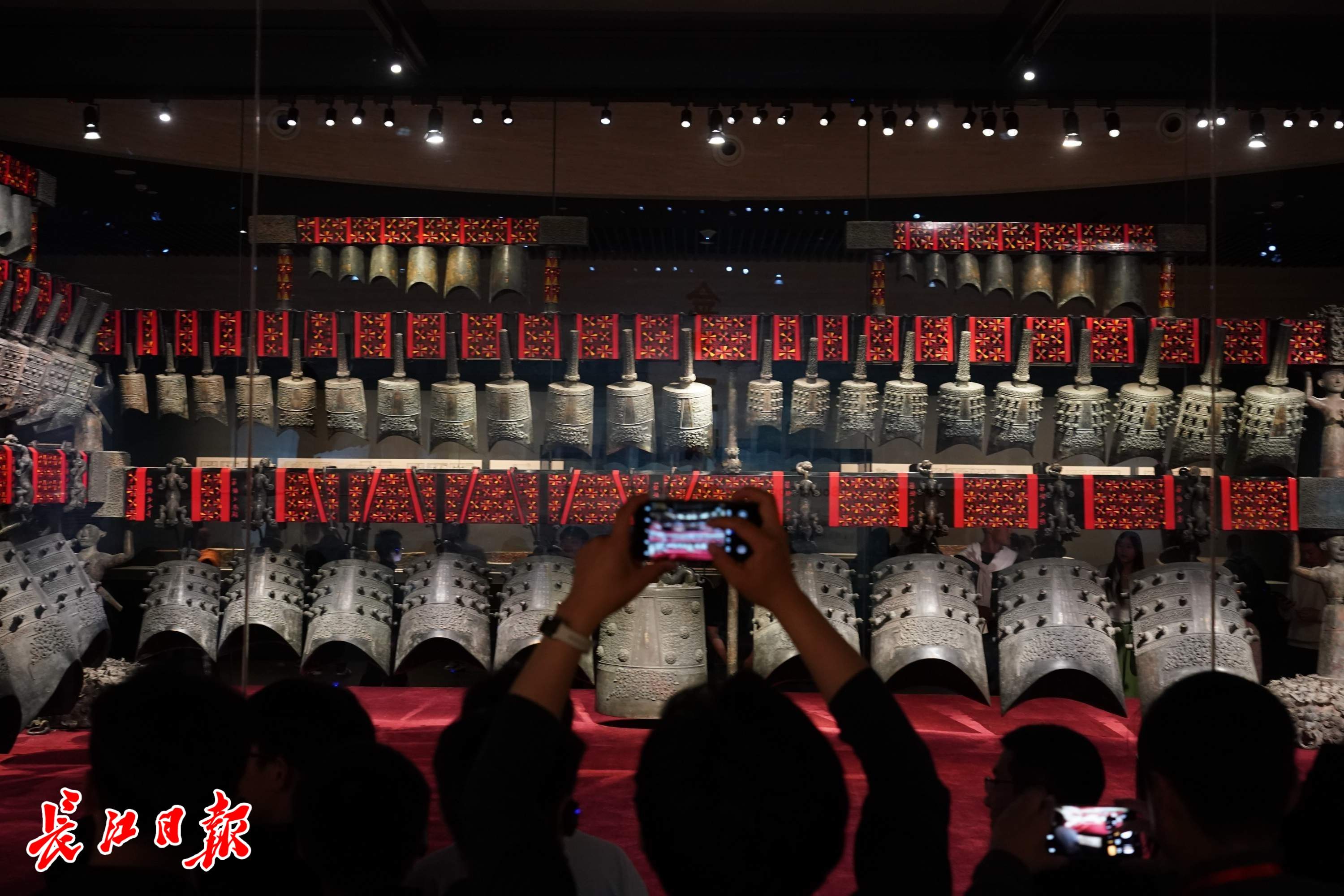 在曾侯乙编钟前,学生们凝神静听讲解,眼神中充满好奇与惊叹。“以前只在课本和网络上看过编钟,今天亲眼见到,这么庞大、这么精美,太震撼了!”湖南高二学生刘明薇兴奋地说。她与同学们围着玻璃展柜,仔细观察着编钟上繁复的纹饰,“听导师讲解了解到古人‘一钟双音’的智慧,觉得我们祖先真是太了不起了。”
