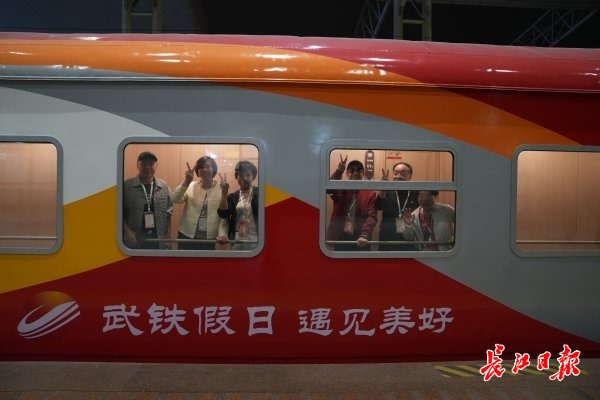 4月15日20时07分,一声悠长的汽笛划破夜空,车体为红、橙、黄为主色调的Y121次“遇见美好”号旅游专列缓缓从武昌站开出。站台上,工作人员挥手致意,车厢内的旅客纷纷贴近车窗回应。