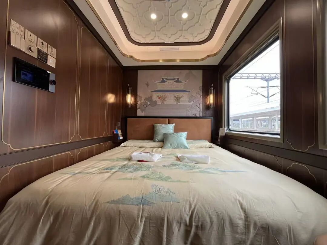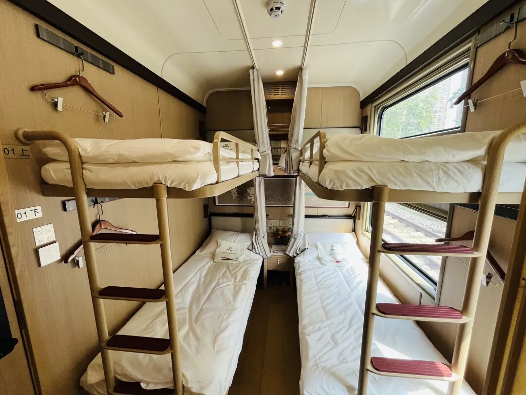 列车共有18节车厢,其中14节车厢是客房,其他车厢为多功能活动室、发电室、餐厅茶室。两人间配备2米宽单人床和1.8米双人床房,三人、四人间增设隐私拉帘。上下铺均配备独立观景窗,打破传统卧铺“下铺无窗、上铺靠窗”的观景局限。房间采用防滑地板,配置组合式衣柜、干湿分离独立卫浴,卫生间增设安全扶手,如厕、淋浴、起身,每一个动作都有支撑点。