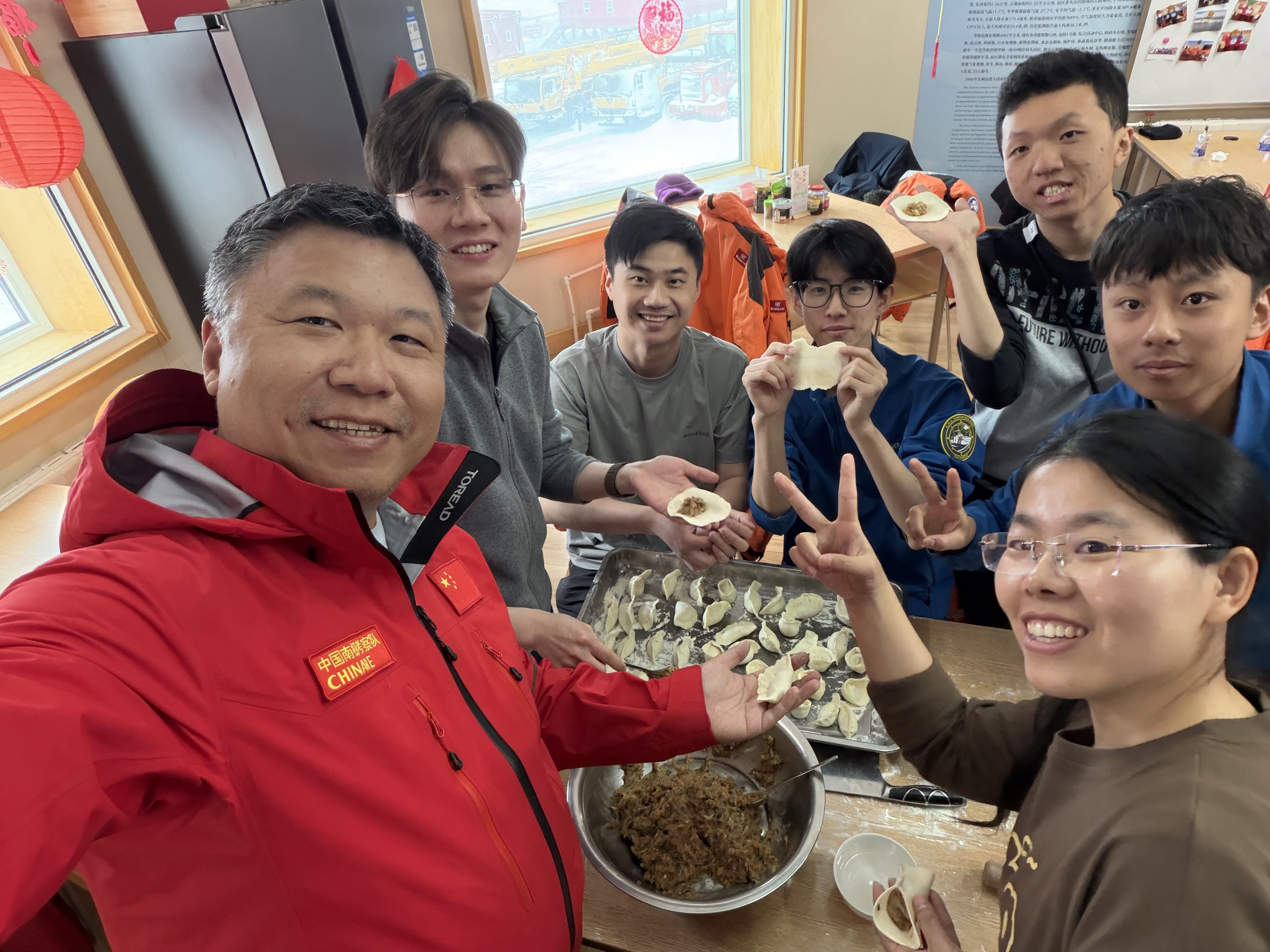 今年马年春节,臧琳(右一)和队友们一起在长城站包饺子。