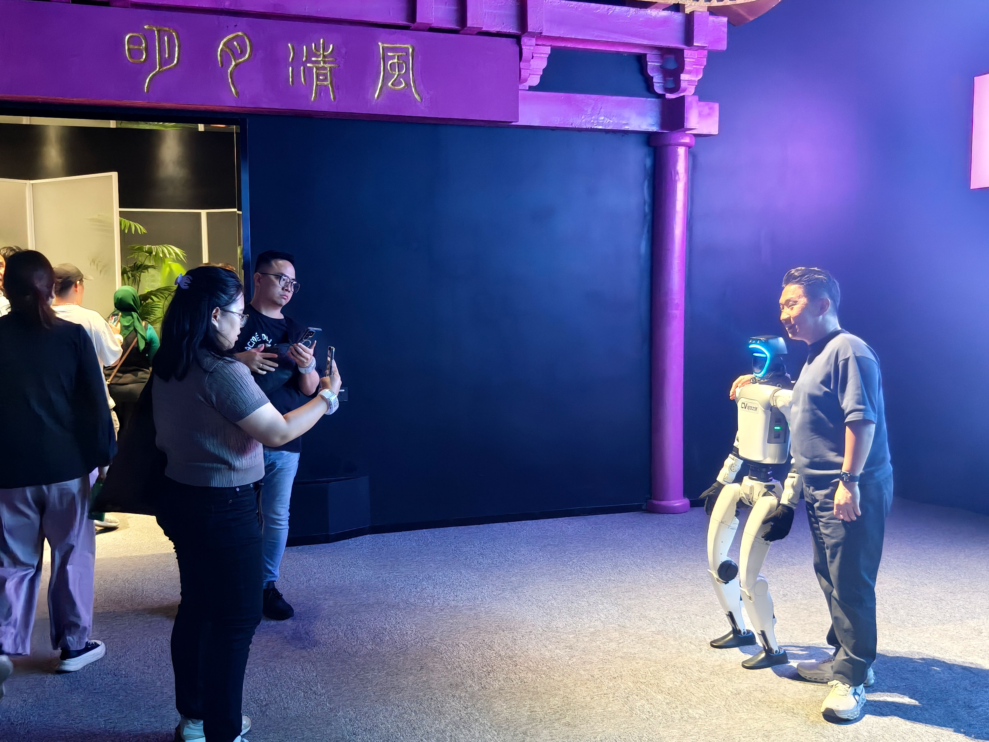 印尼游客们观看机器人跳舞。