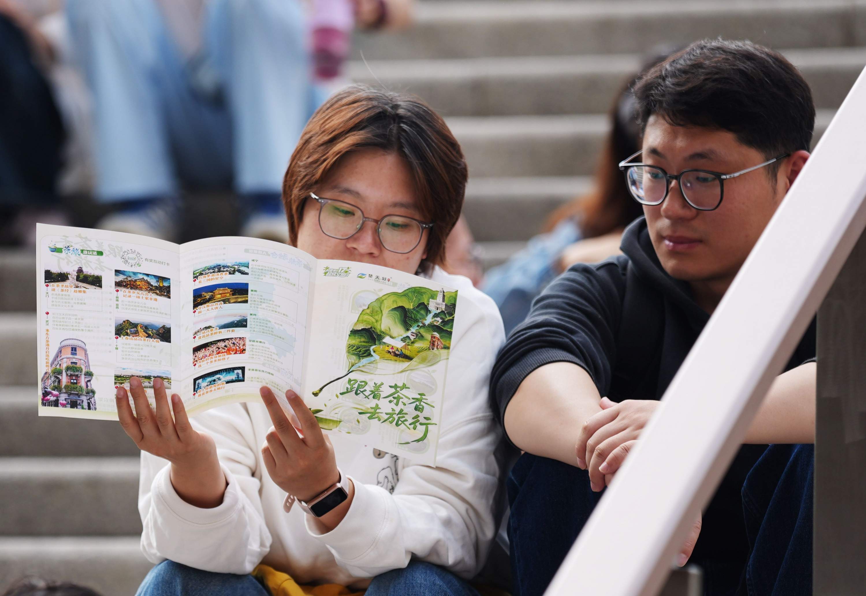 武商梦时代茶旅小驿展位前台阶上,游客在看“跟着茶香去旅行”小册子。