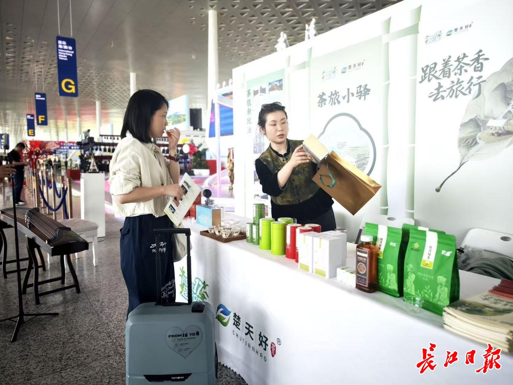 天河机场过往乘客在茶旅小驿前了解湖北茶和茶旅线路。记者何晓刚 摄