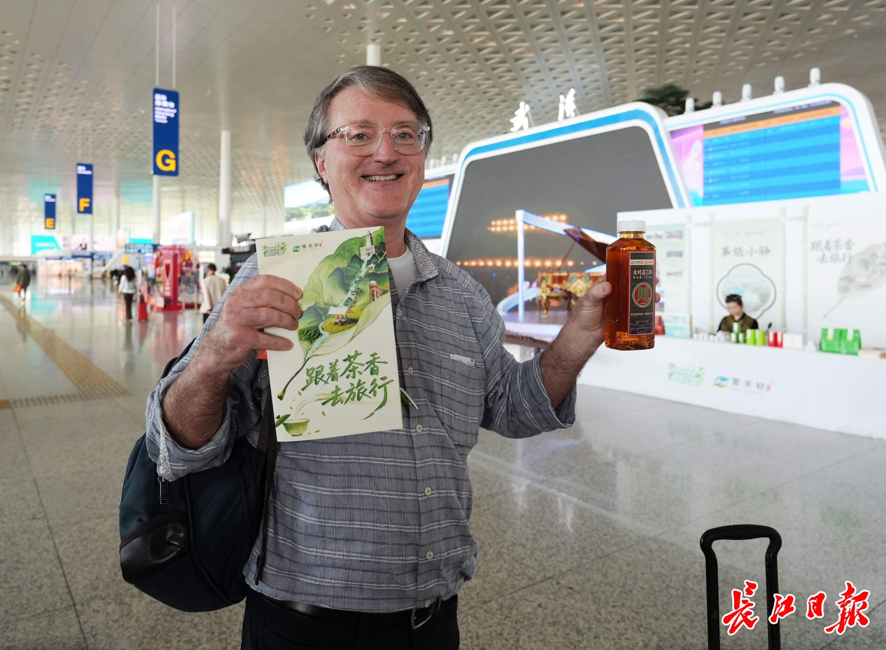 美国游客持“跟着茶香去旅行”小册子和青砖茶饮料留影。 记者何晓刚 摄