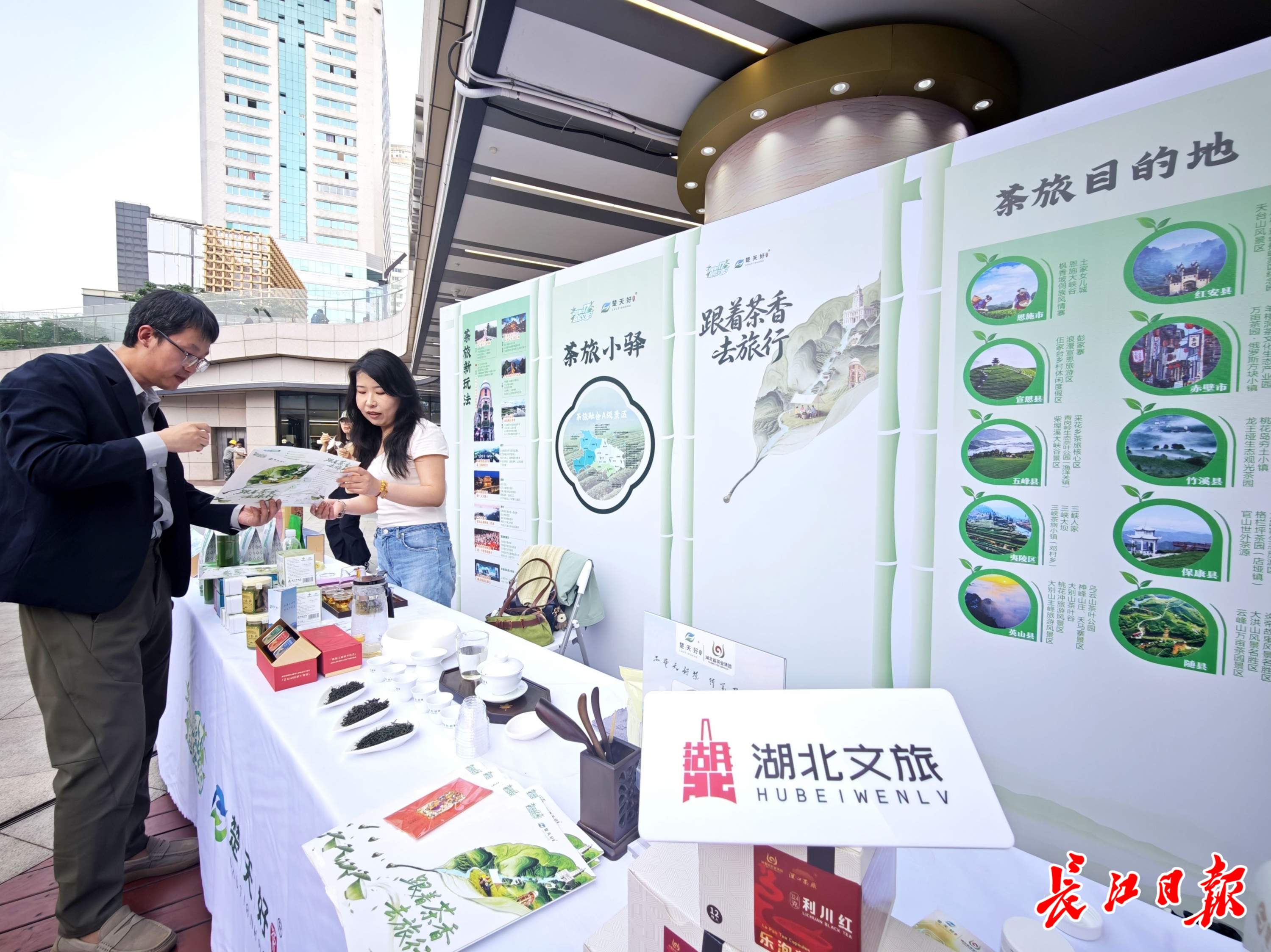 武商梦时代下沉广场茶旅小驿展位,展示湖北茶和茶旅线路。 记者何晓刚 摄