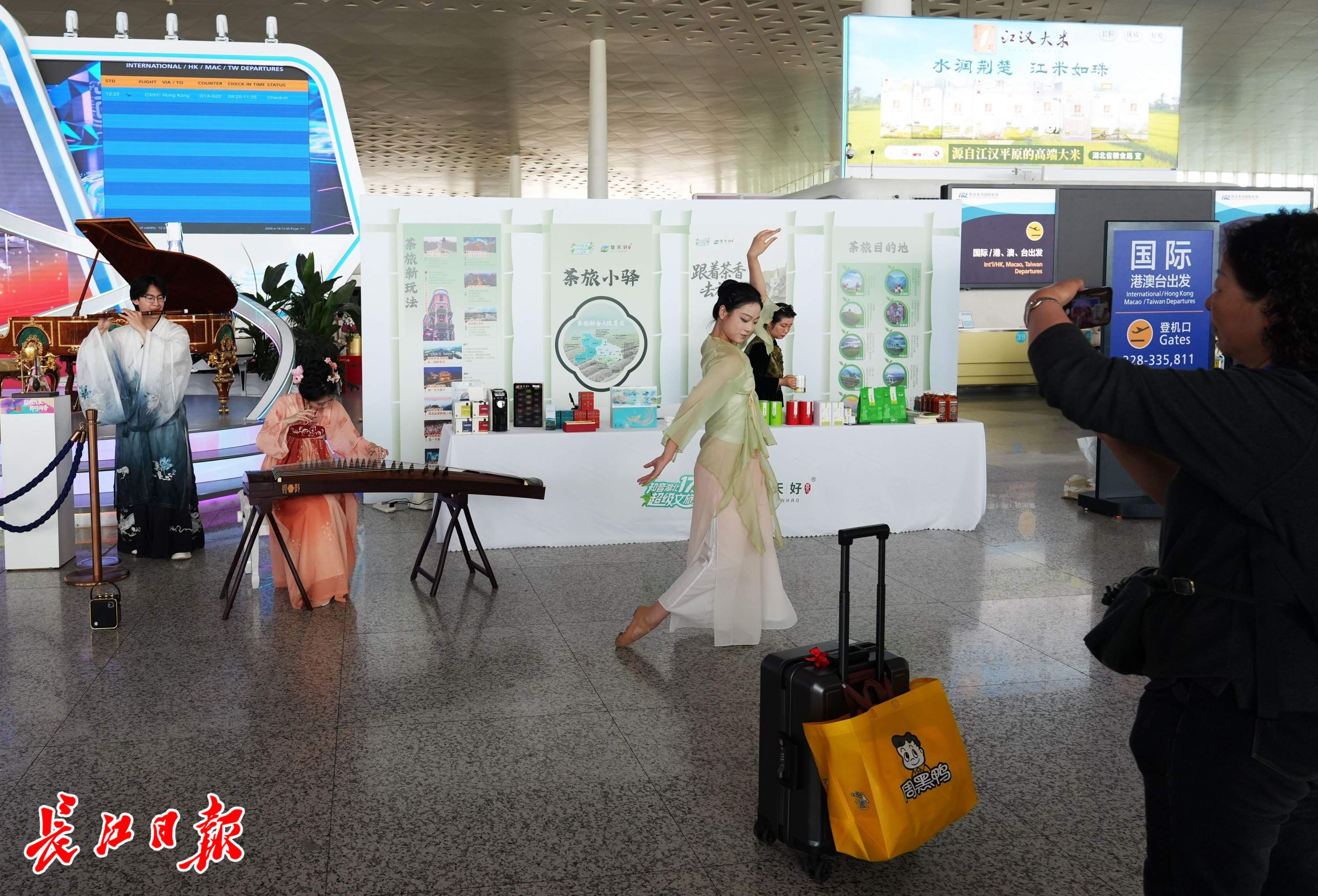 上午9时许,天河机场出发大厅茶旅小驿古风舞蹈表演开始,乐声悠扬,舞姿曼妙,不少过往乘客驻足观赏,大家不约而同掏出手机拍摄。