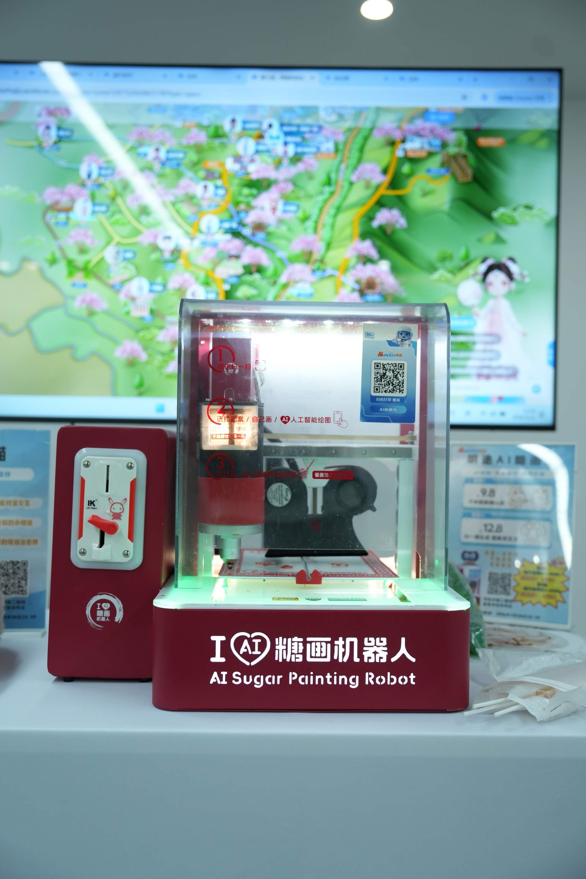 这款AI糖画机融合了人工智能与非遗糖画工艺,游客可以通过App自定义图案,机器就能自动完成熬糖、绘制、成型全流程操作,简单安全、高效便捷。“就是这个机器,春节时一个达州姑娘买了一台回去,放在老家文化公园。10块钱画一幅,一周就卖了400多份,本钱回来了还赚了不少。”负责人周波笑着介绍。