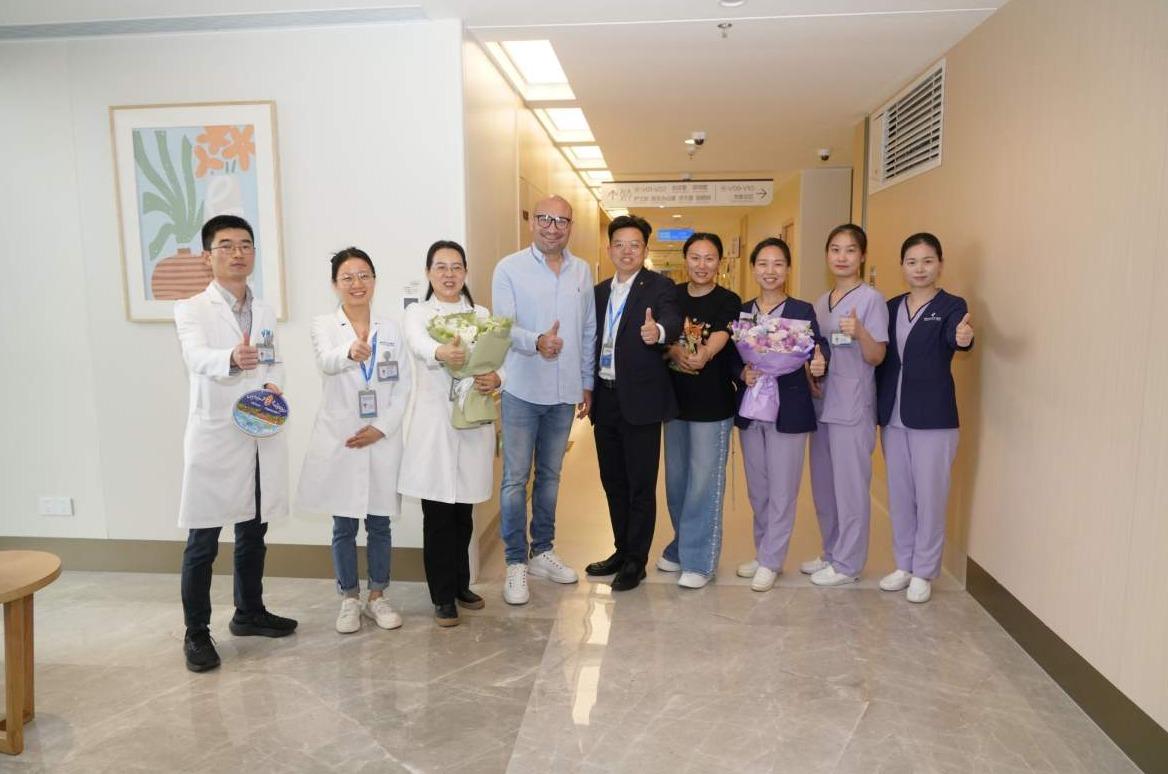 维克托(左四)、蒋思婕(右四)与医师陈晓英(左三)、护士长黄娟(右三)等合影。 泰康同济(武汉)医院 供图