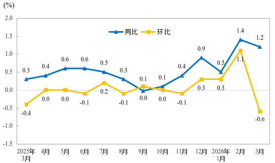 2025年3月—2026年3月武汉市CPI涨跌幅分月走势。