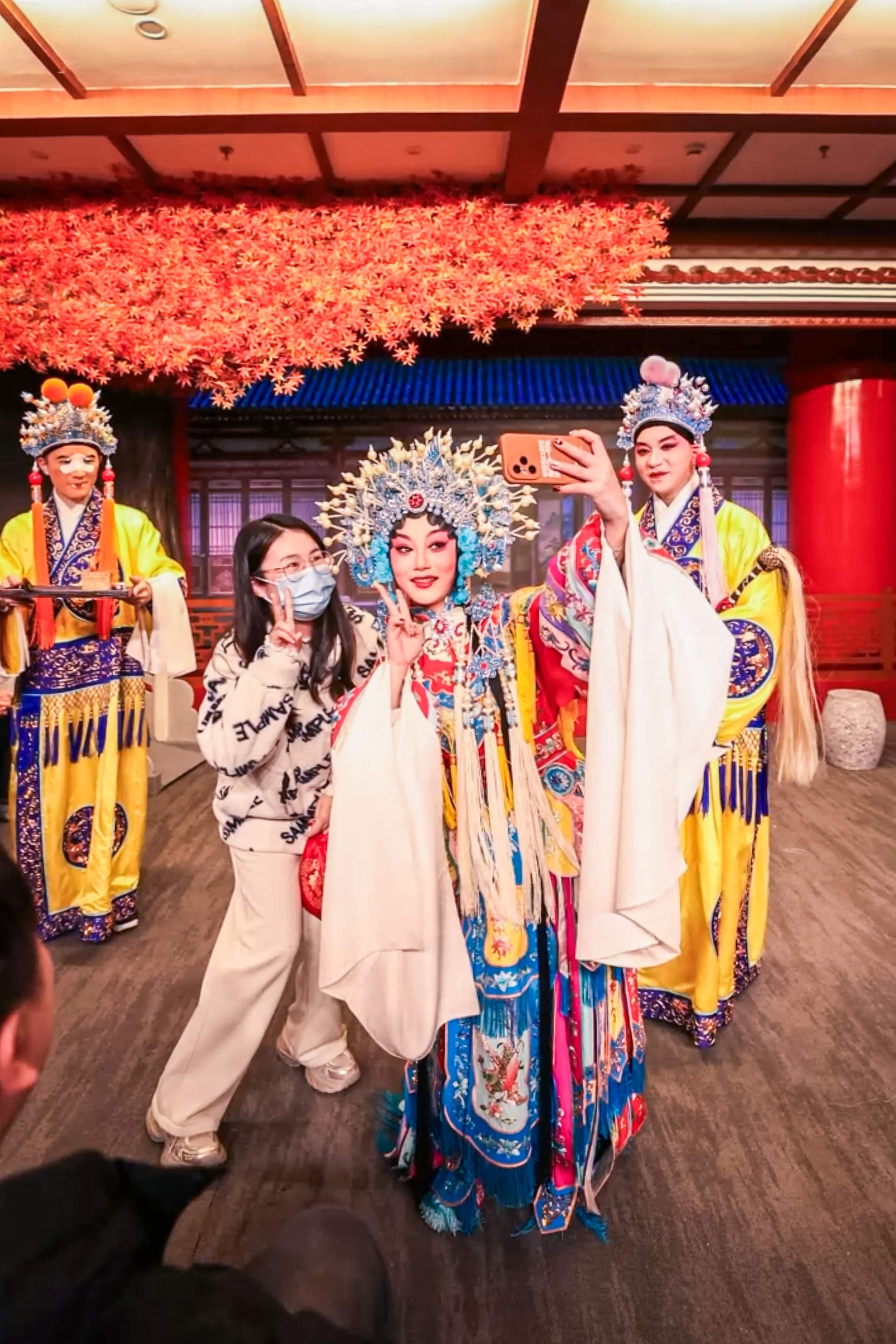 体验沉浸式戏游版汉剧《贵妃醉酒》的游客和演员合影。曾熙来 摄