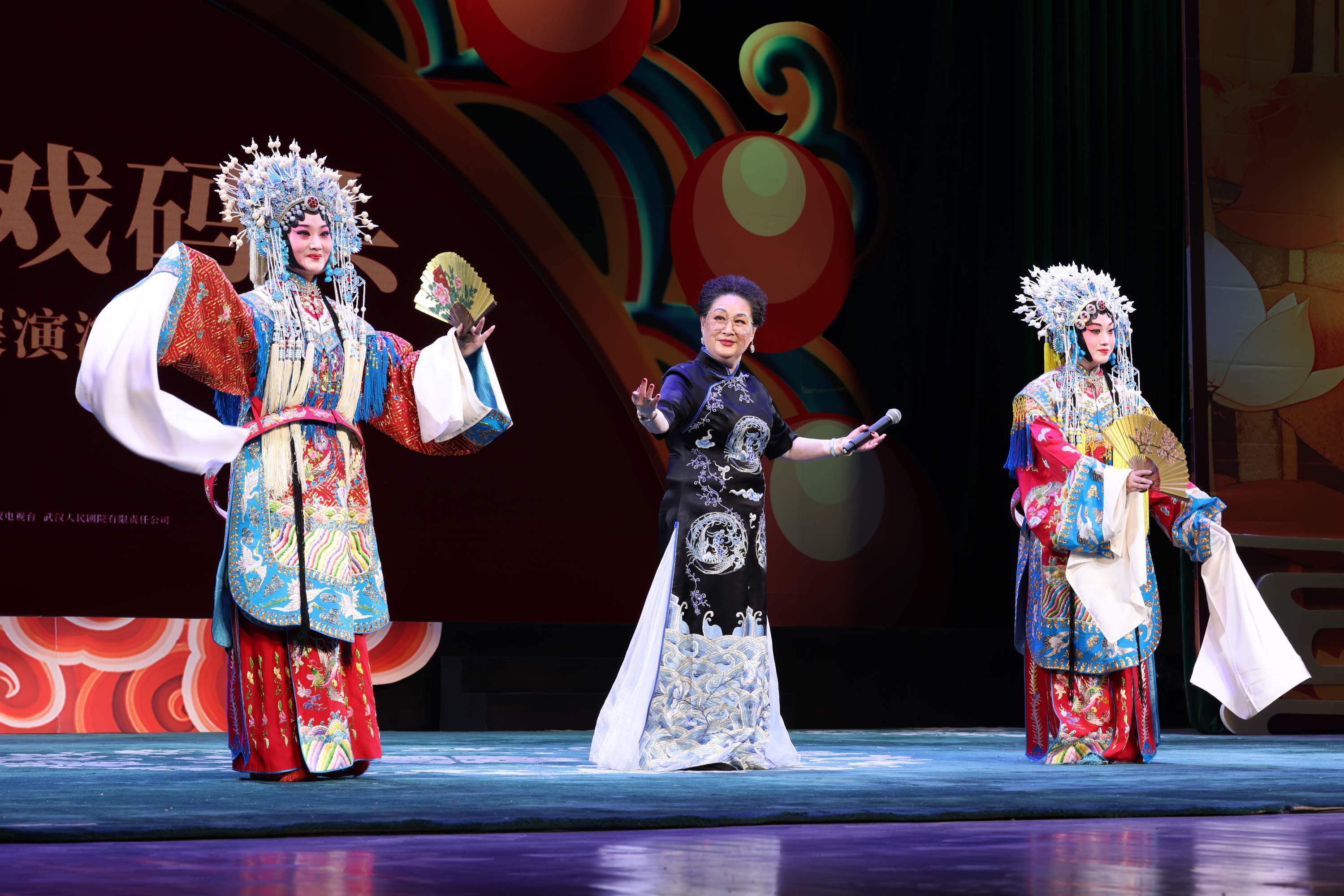汉剧国家级非遗代表性传承人胡和颜(中)和弟子们在“百戏工程”成果展演中同台演出。武汉汉剧院供图