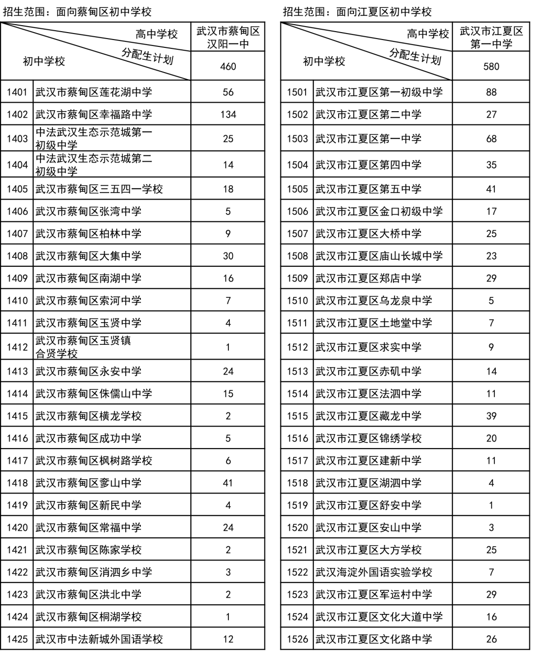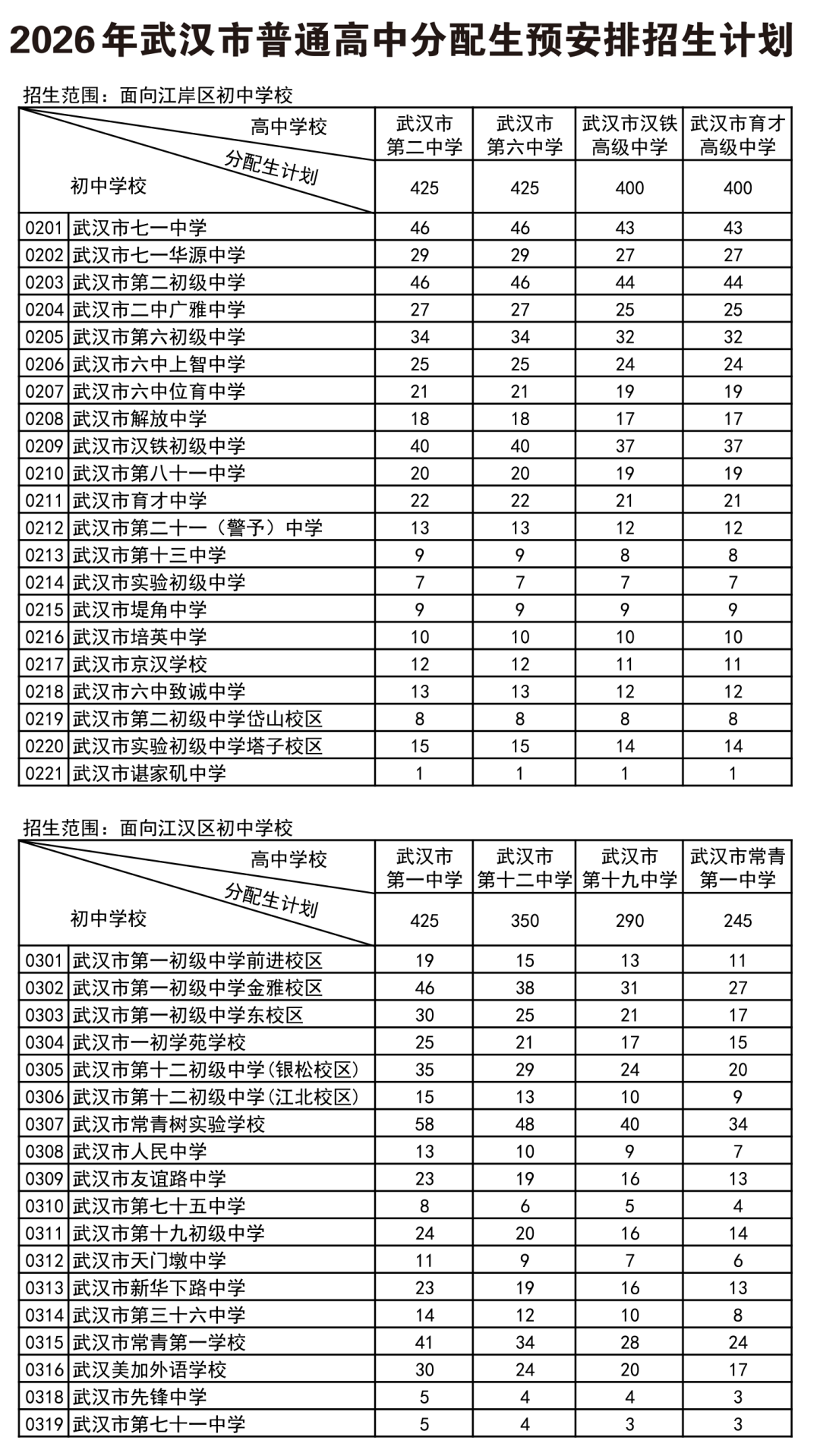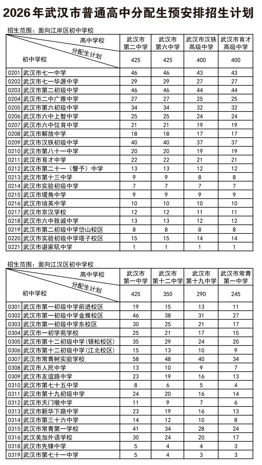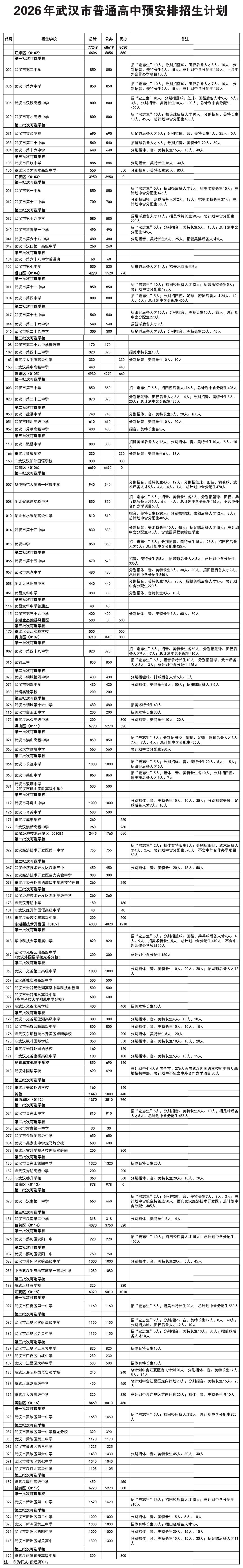 部分学校招生批次有变化:武汉大学附属中学整体由第二批次升至第一批次招生,计划招生560人;武汉经济技术开发区汉阳三中整体由第三批次升至第二批次招生,计划招生450人。