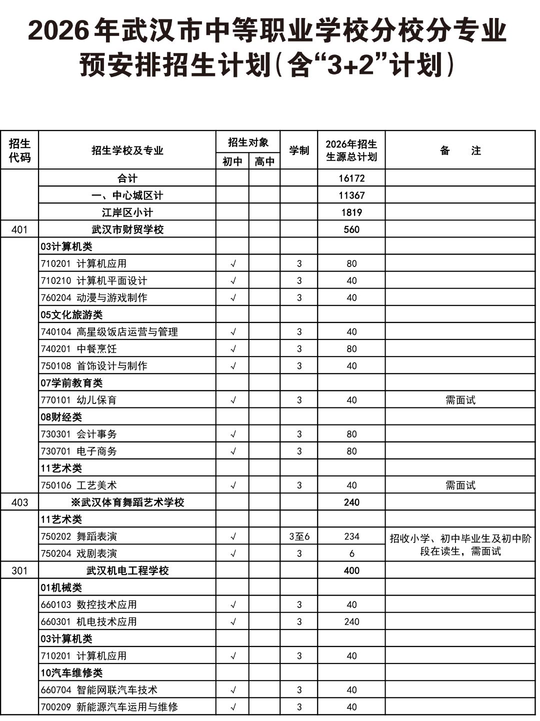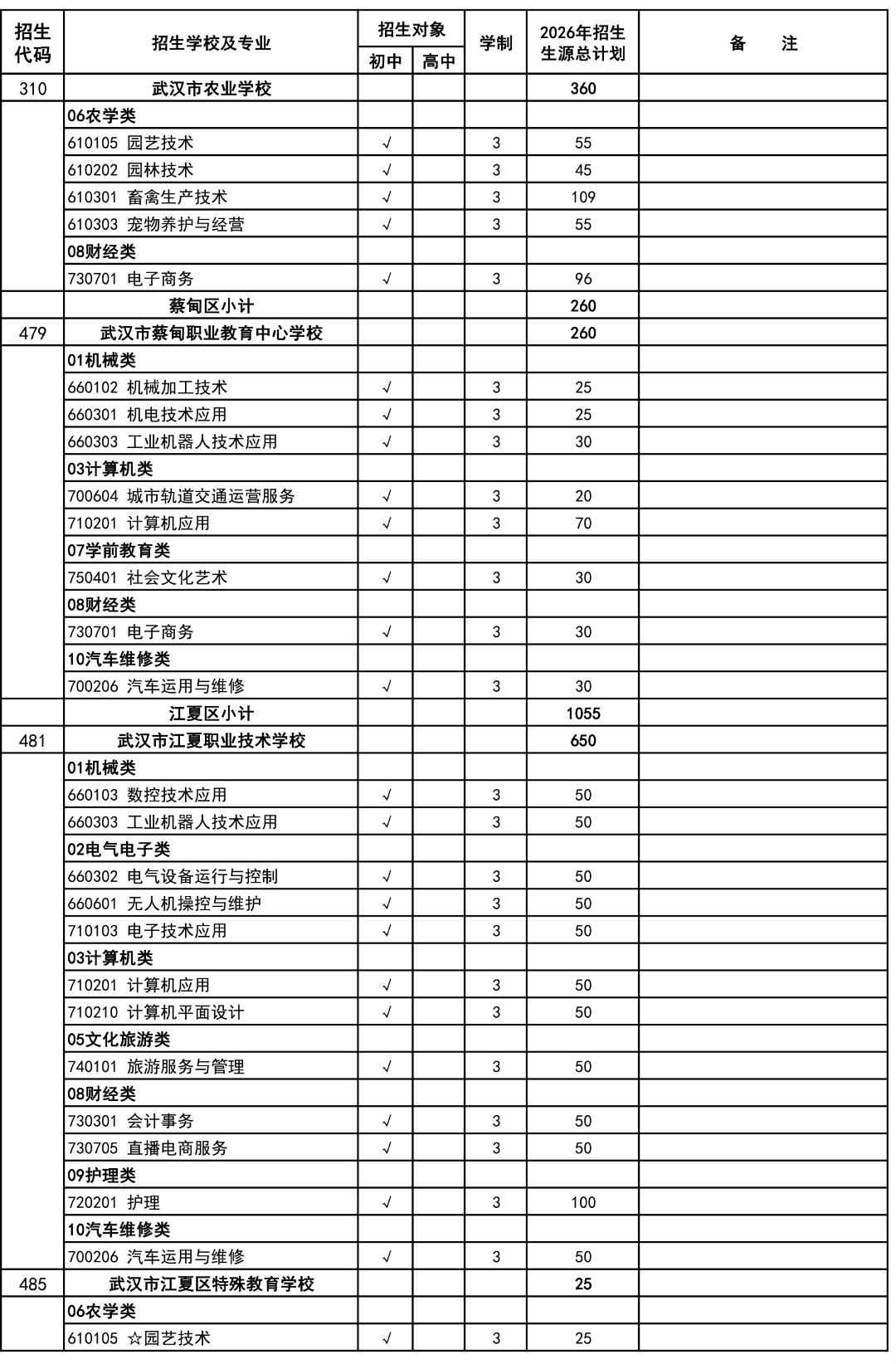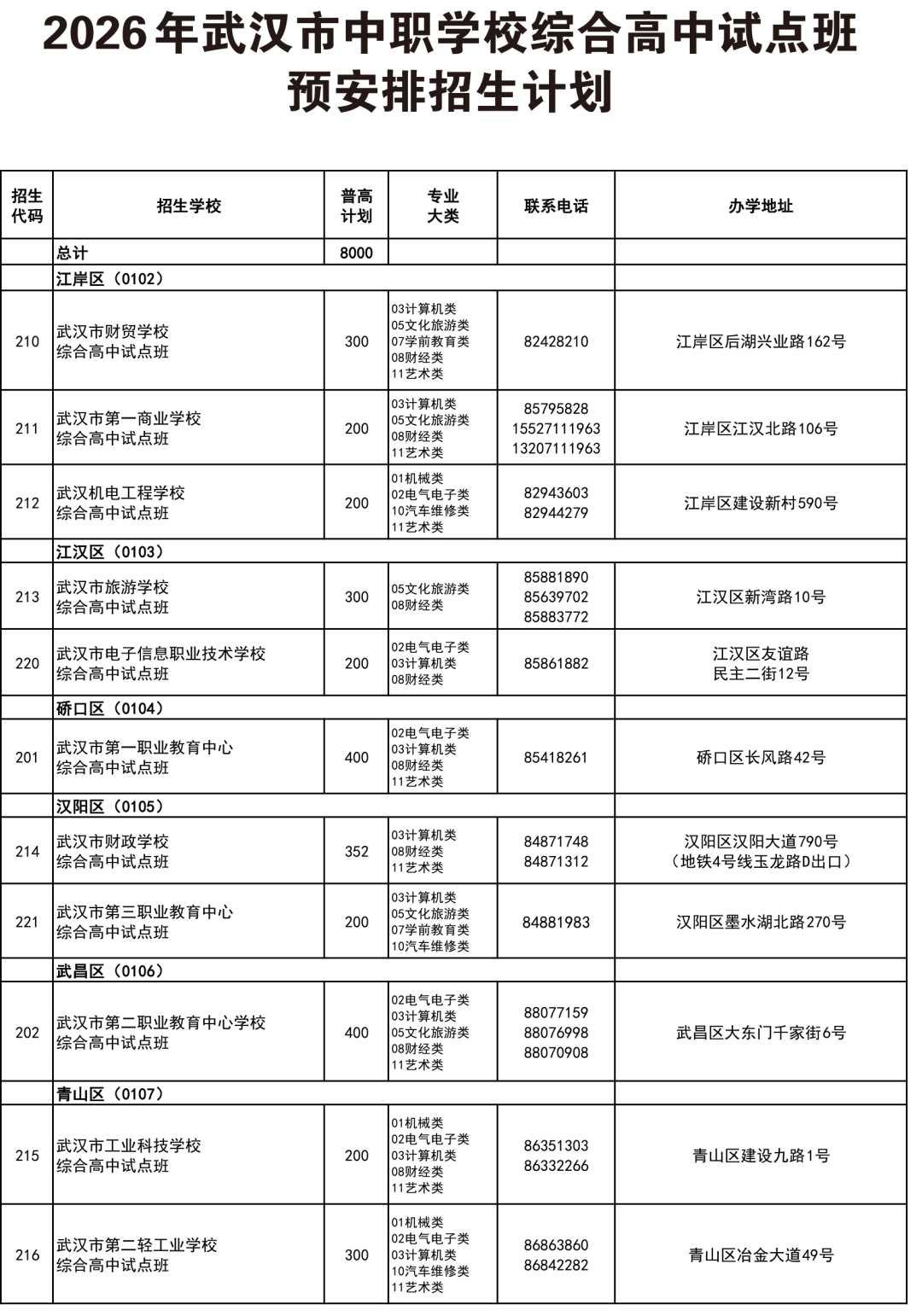 2026年武汉市中职学校综合高中试点班预安排招生计划