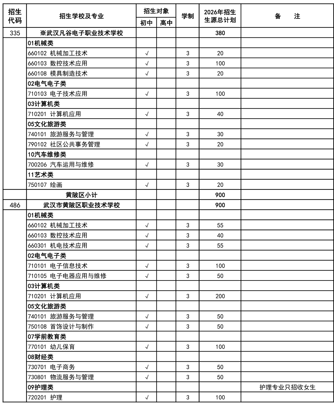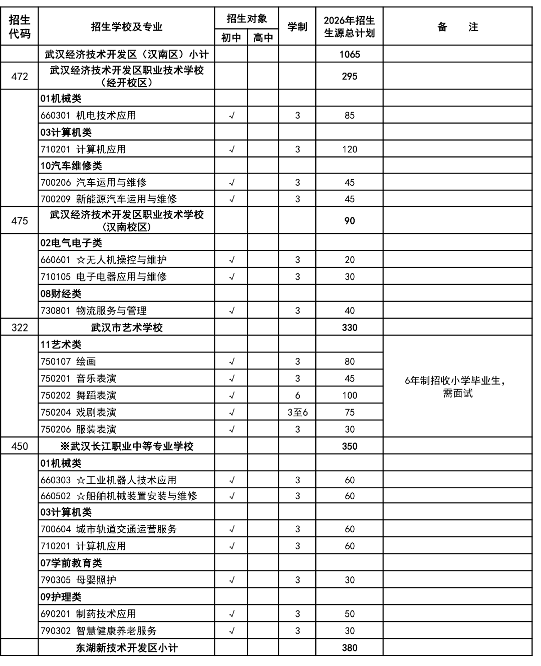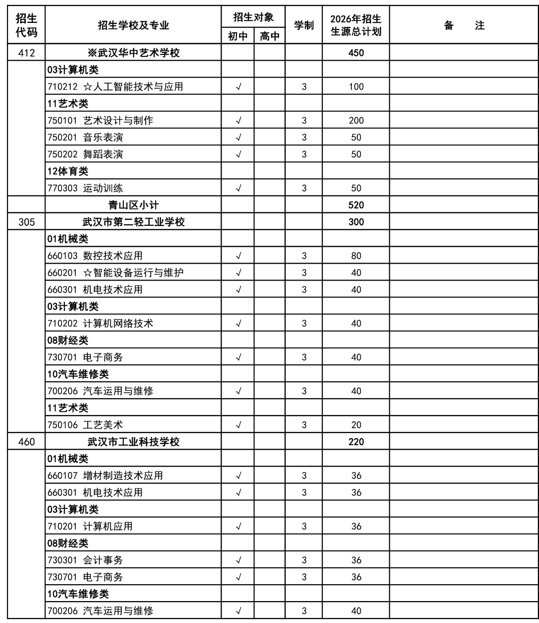2026年武汉市中职学校综合高中试点班预安排招生计划