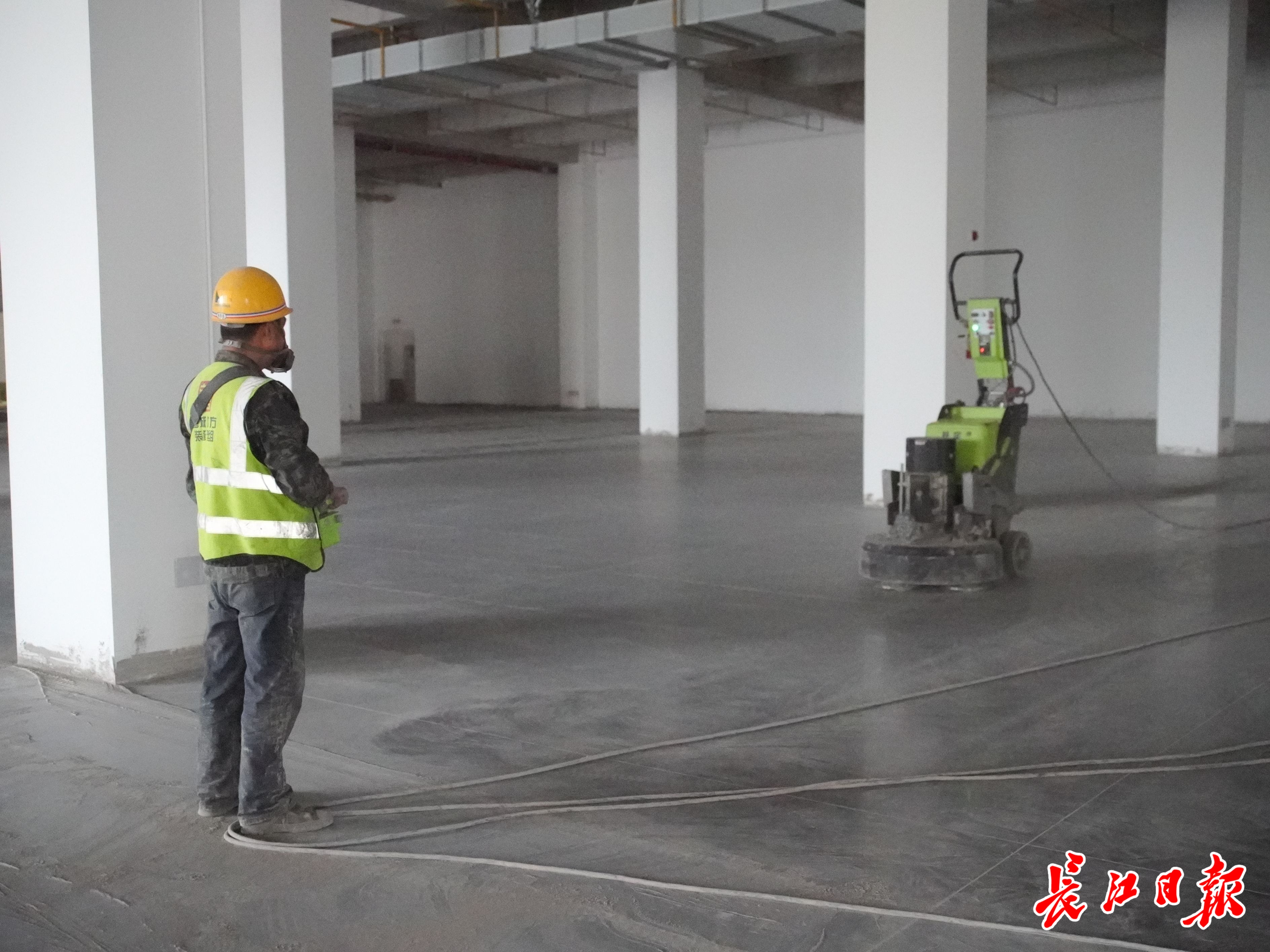 走进旁边一栋厂房,两台无人驾驶打磨机自动来回作业,圆形磨石匀速旋转。“以前手推或驾驶打磨机,费力还不均匀,现在这台机器又稳又平。”工人师傅一边盯着设备一边说道,这里金刚砂面层加固化剂密封施工,完成后可以提高地坪表面的光泽度与密实度。