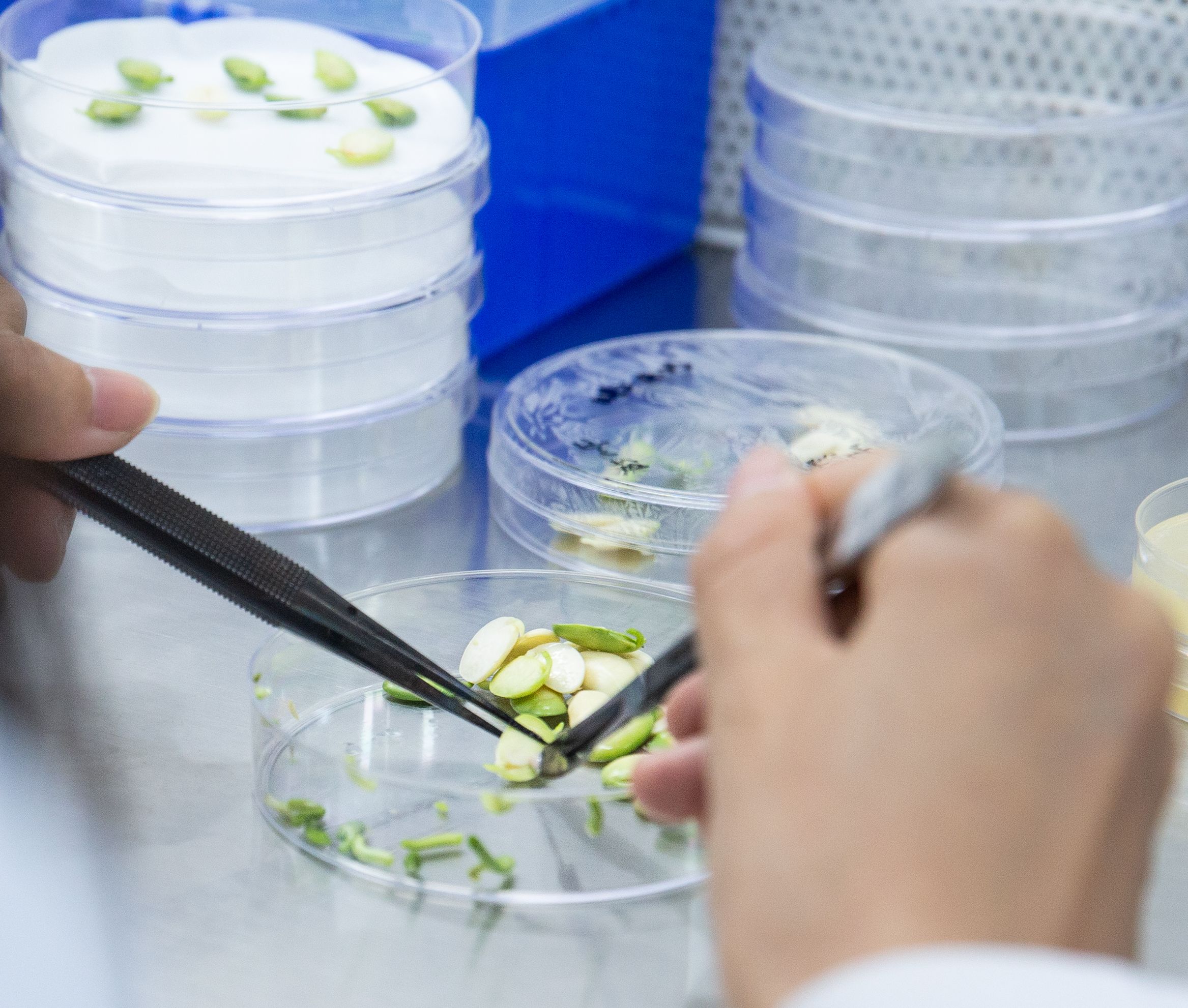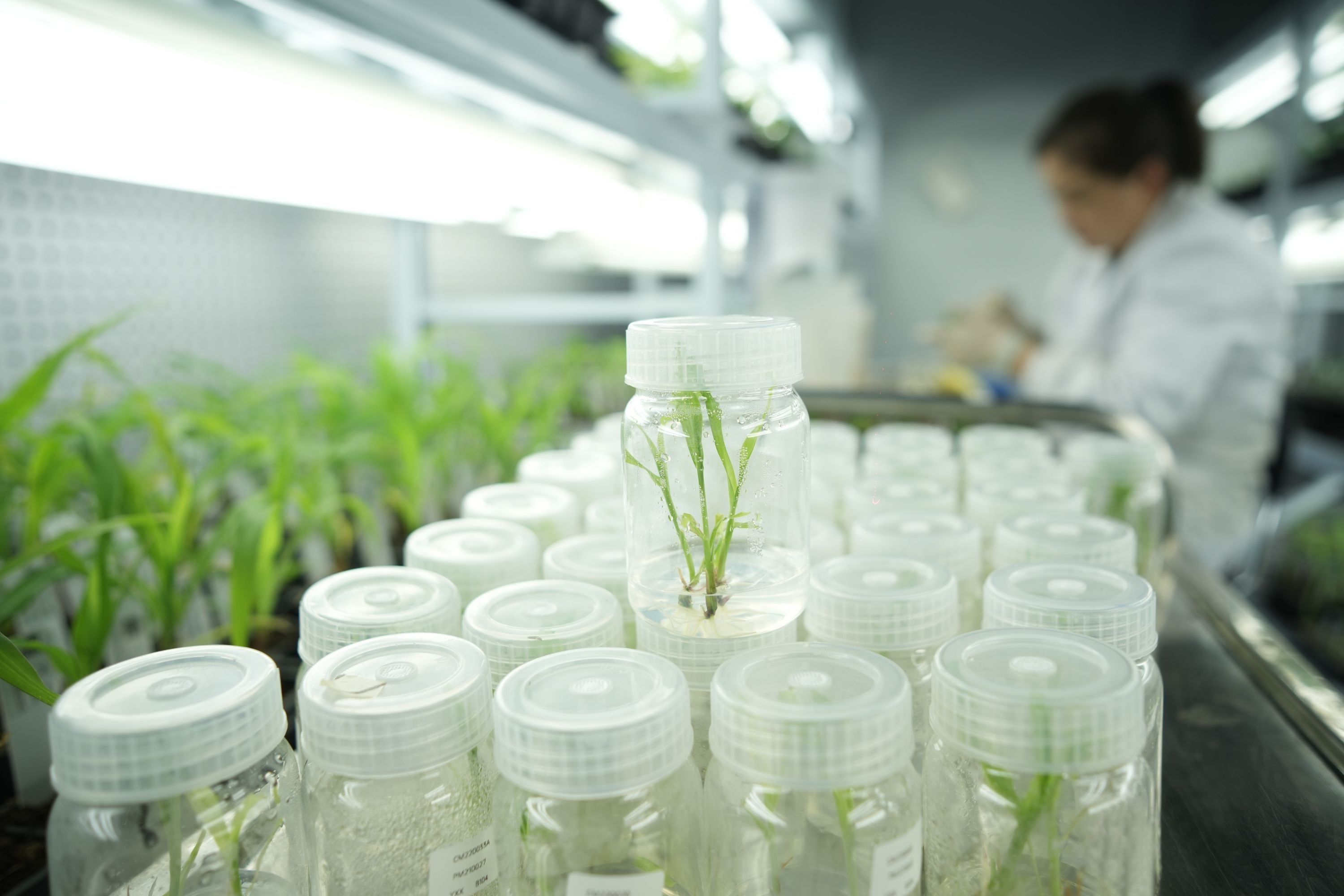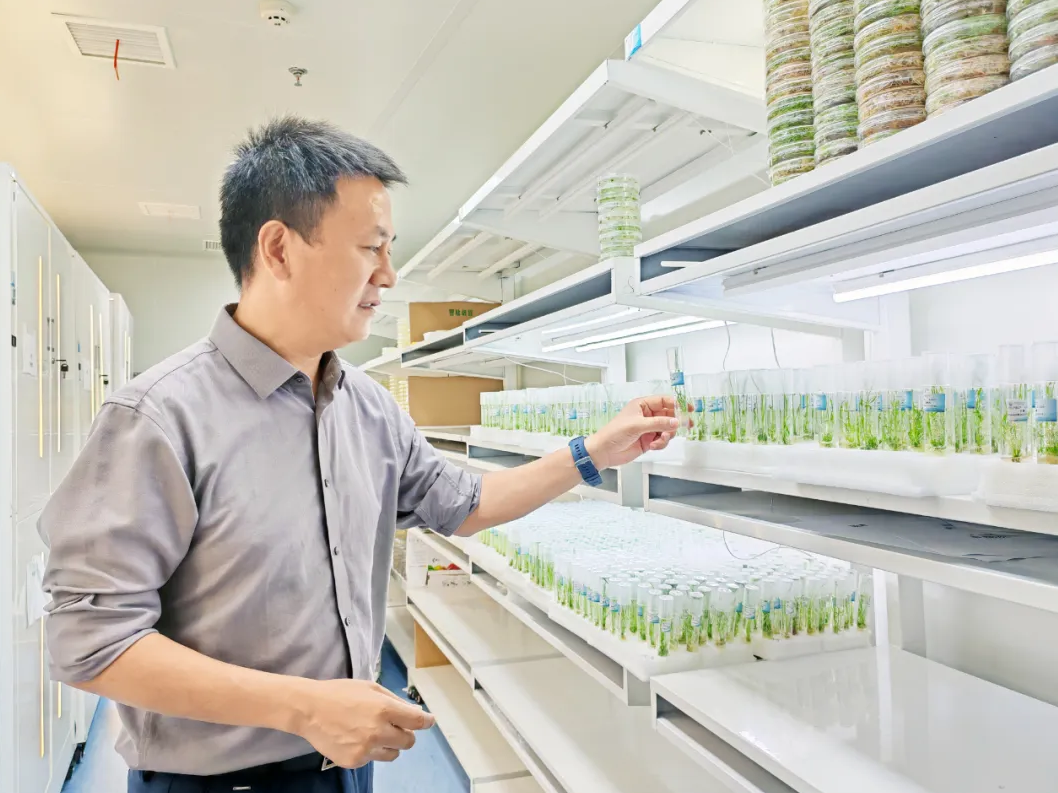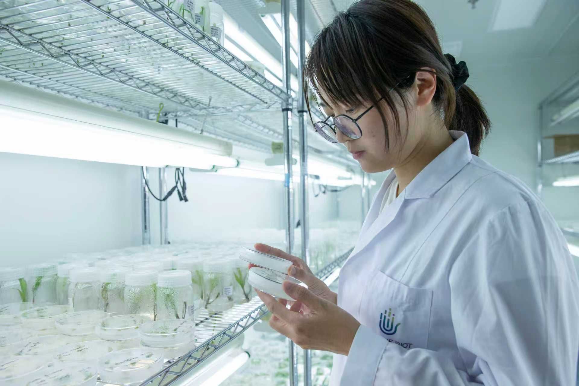 艾迪晶实验员查看组培苗生长状态。