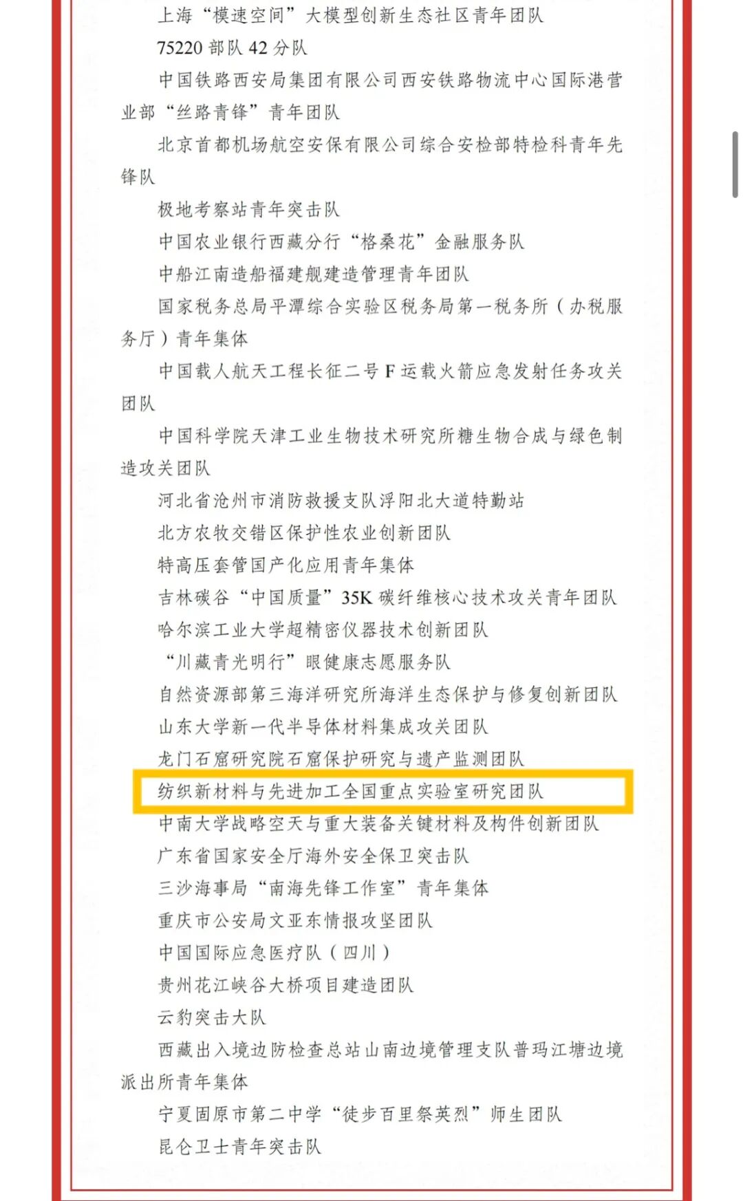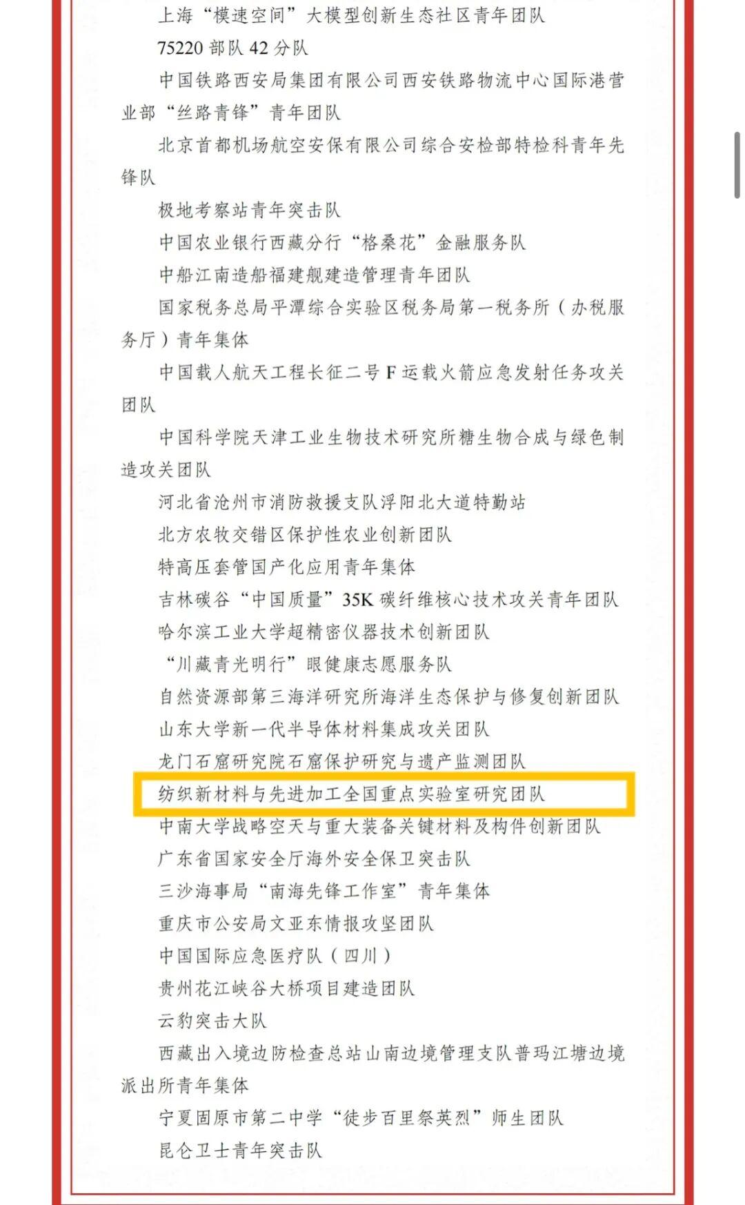 此次评选中,武汉纺织大学纺织新材料与先进加工全国重点实验室青年团队荣获中国青年五四奖章。该团队研制的月面国旗成功探月,研小口径人造血管逐步进入临床,已授权国家发明专利105件,完成成果转化21项。