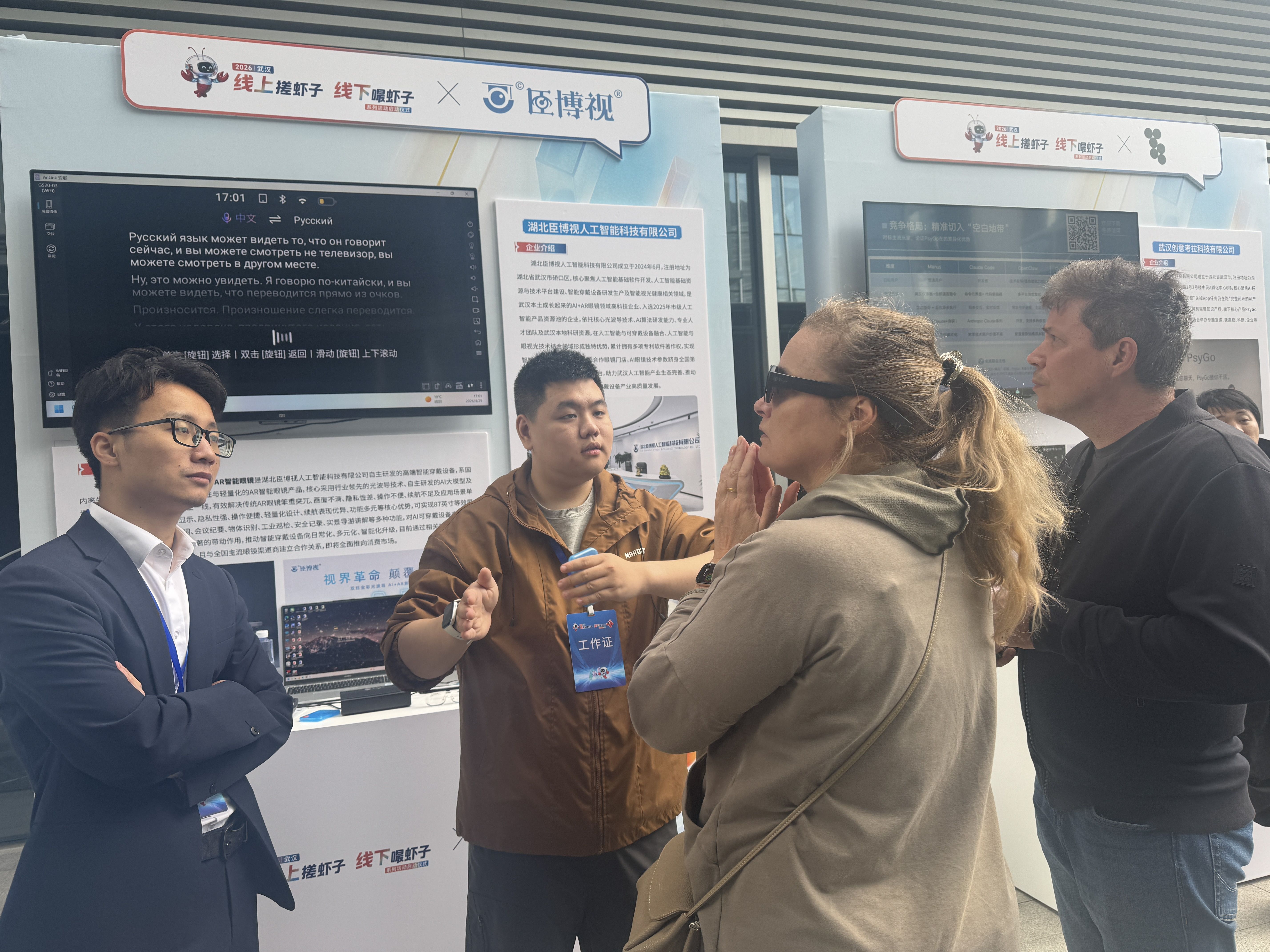 长江日报大武汉客户端4月30日讯(记者叶诗雨)“虽然翻译机器也能翻译,但是这款智能眼镜能让我们实时沟通,开会就方便多了。我会考虑购买这样的产品!”4月29日,武汉举行“线上搓虾子 线下嘬虾子”系列活动启动仪式,来自俄罗斯的马拉特·迪夫列特-基尔杰耶夫(Divlet-Kildeev Marat)和夫人在会场AI产品展示区佩戴AI+AR智能眼镜时感叹道。
